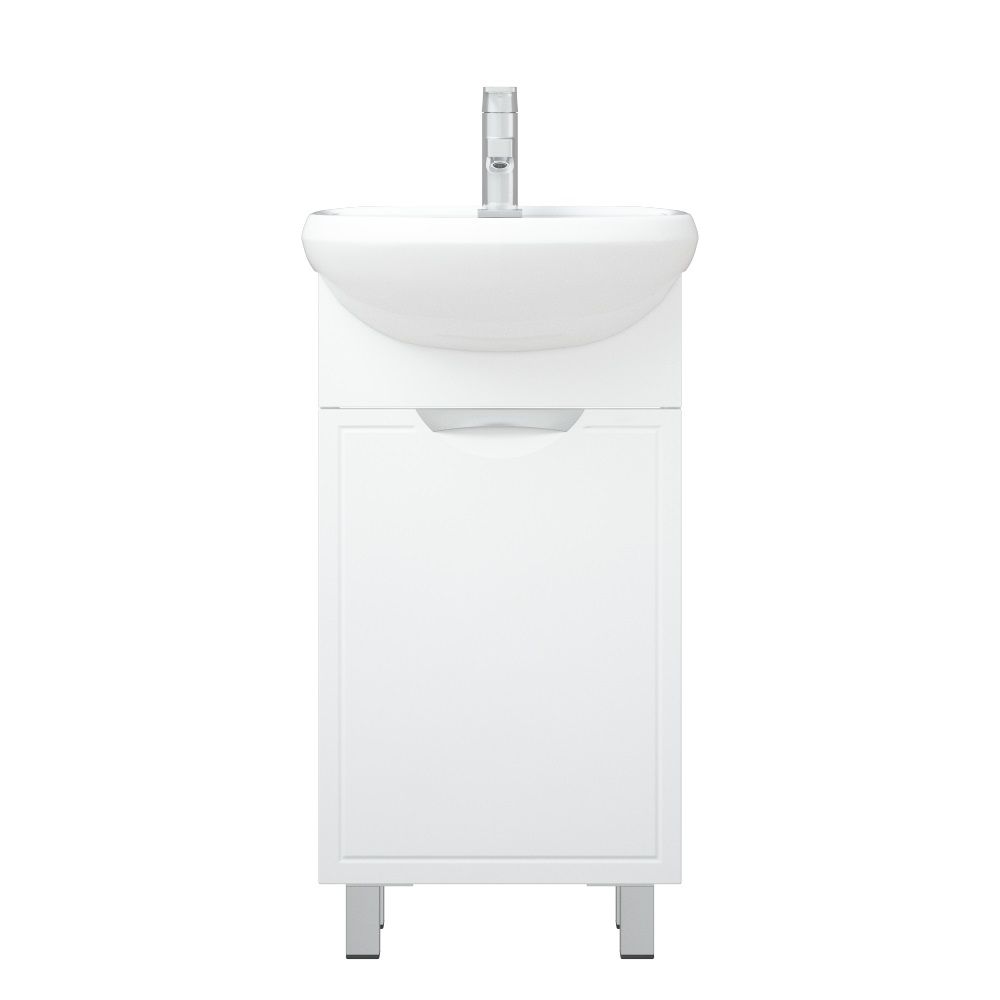 Тумба "Монро 45" оснащена 1 дверцей, позади - 1 полочка. На двери - петли с доводчиками. У тумбы 2 металлические опоры, 1 пластиковая. Коромысло и фасад - МДФ в плёнке.