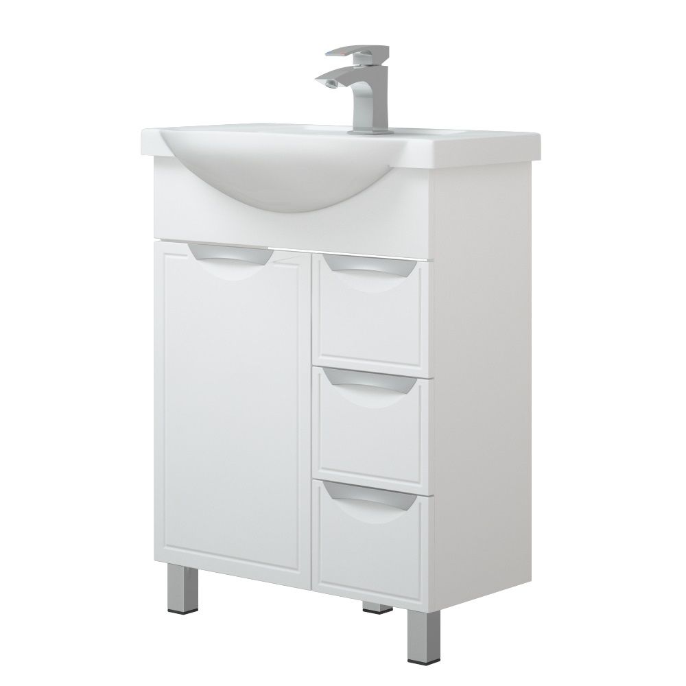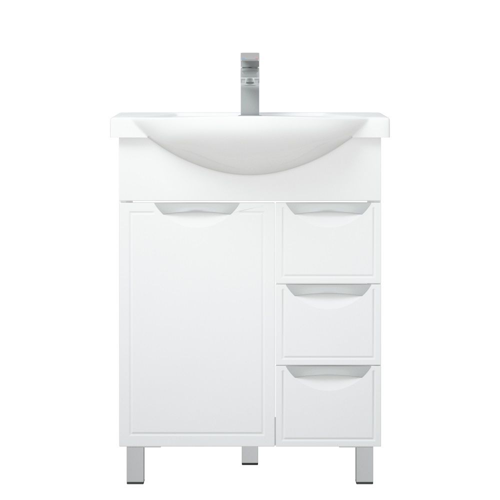У тумбы "Монро 65 Z3" 1 дверца и 3 выдвижных ящика. На дверях - петли с доводчиками. Высота ящиков 110 мм. У тумбы 2 металлические опоры, 1 пластиковая. Коромысло и фасады - МДФ в плёнке.