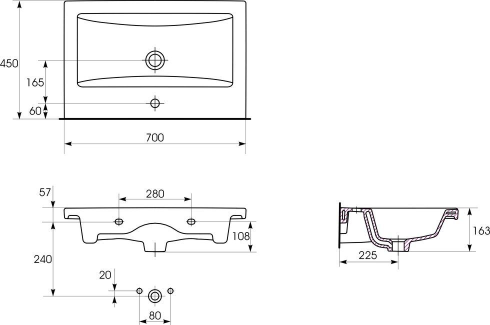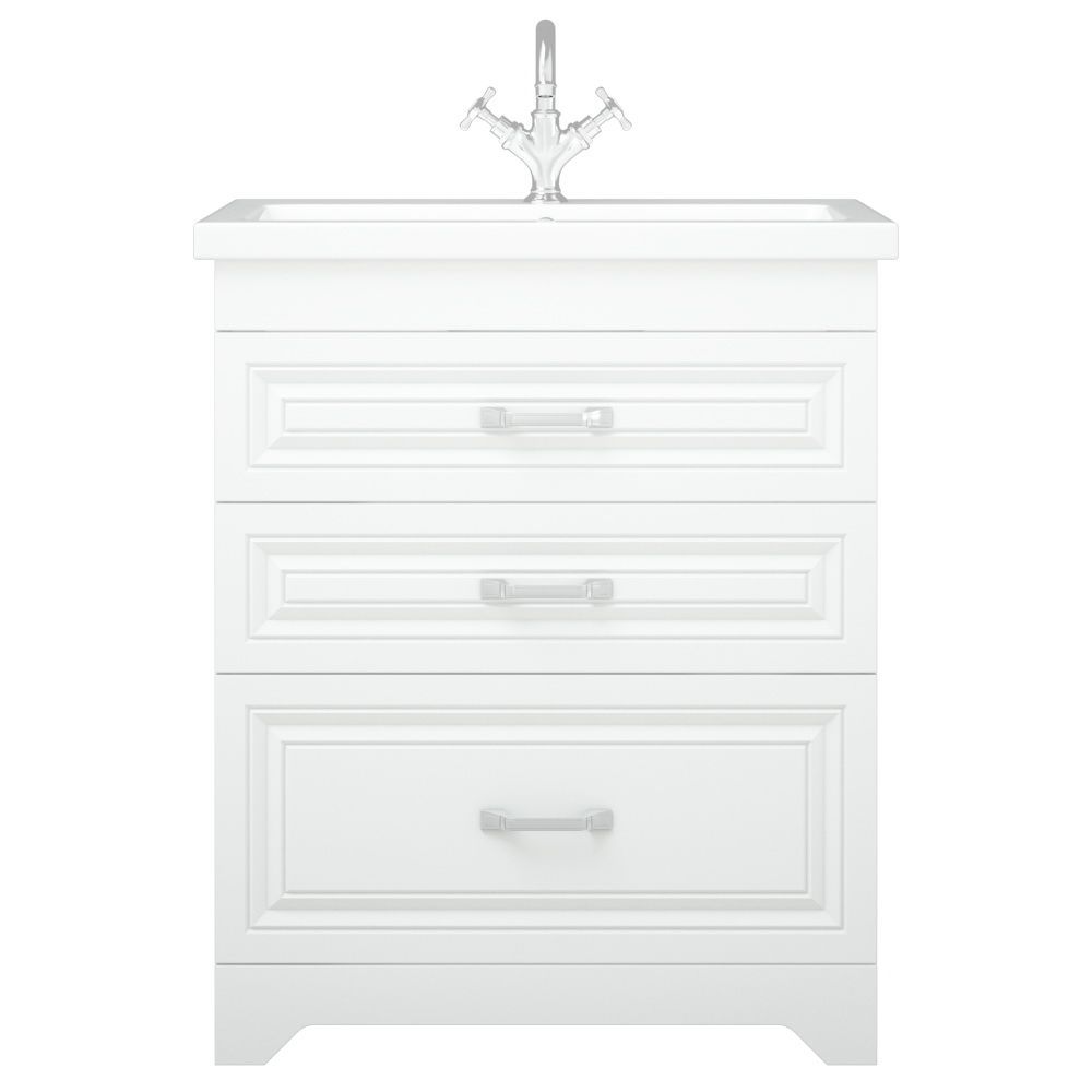 Тумба "Каролина 70" оснащена 3-мя выдвижными ящиками на направляющих скрытого монтажа. Верхний ящик высотой 80 мм с выпилом под коммуникации, средний - 80 мм, нижний - 130 мм. Коромысло, фасады, цоколь - МДФ в плёнке ПВХ.