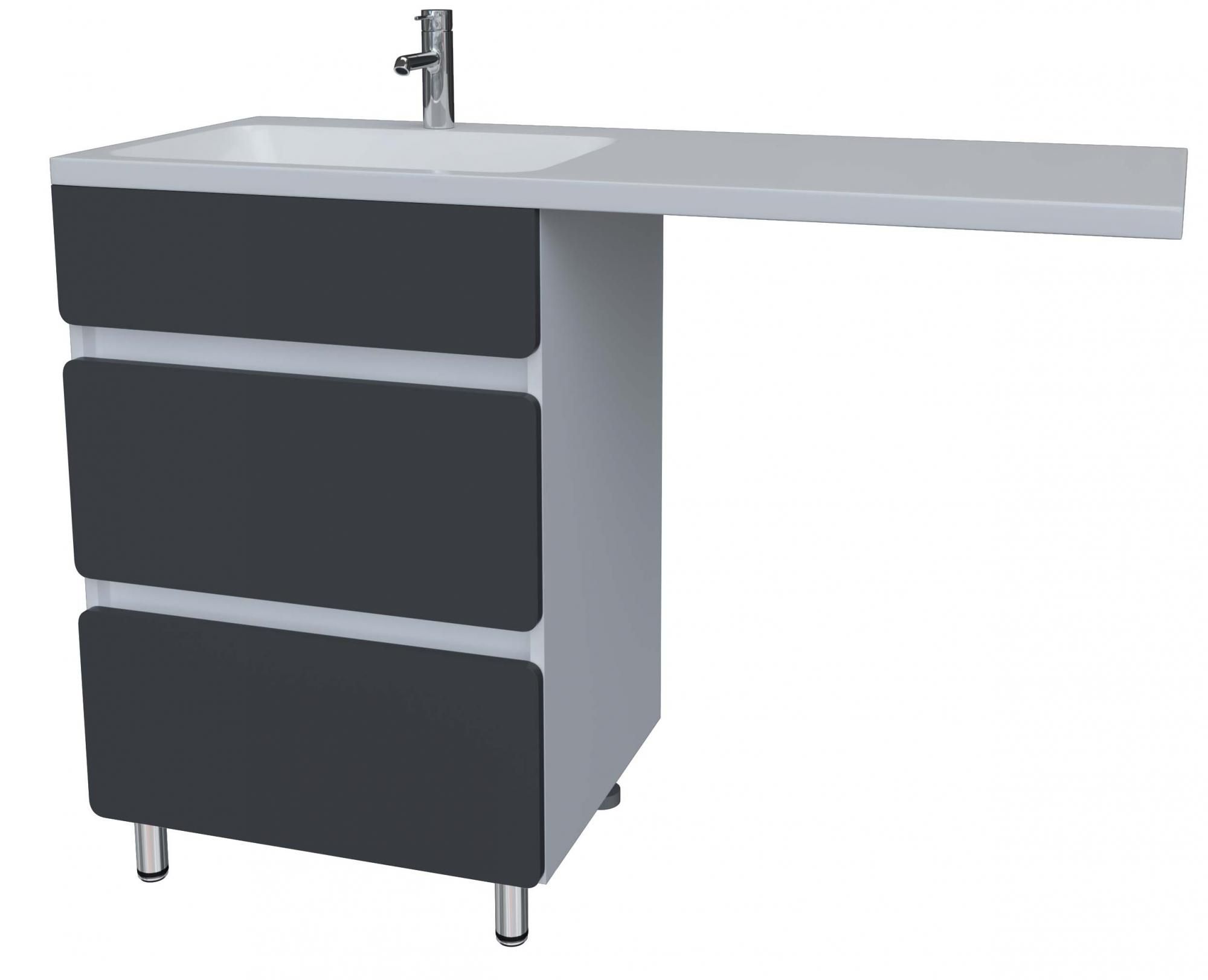 У коллекции "Корделия" изящный внешний вид из-за скругленных фасадов и подвесного пенала, что совершенно не мешает хранить большое количество принадлежностей для ванной комнаты. Опоры металлические, петли с доводчиками, ручки открываются за фасад.