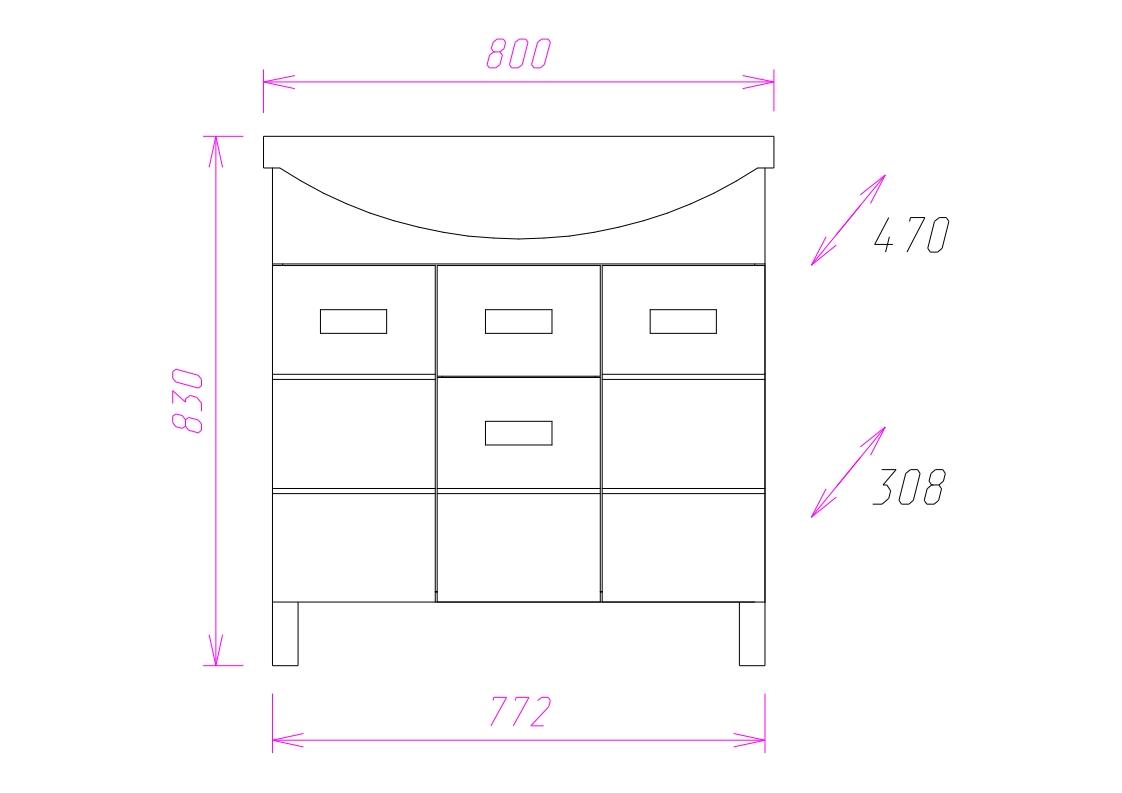 Размеры тумбы без учета раковины и ножек: 77x31x68 см.
