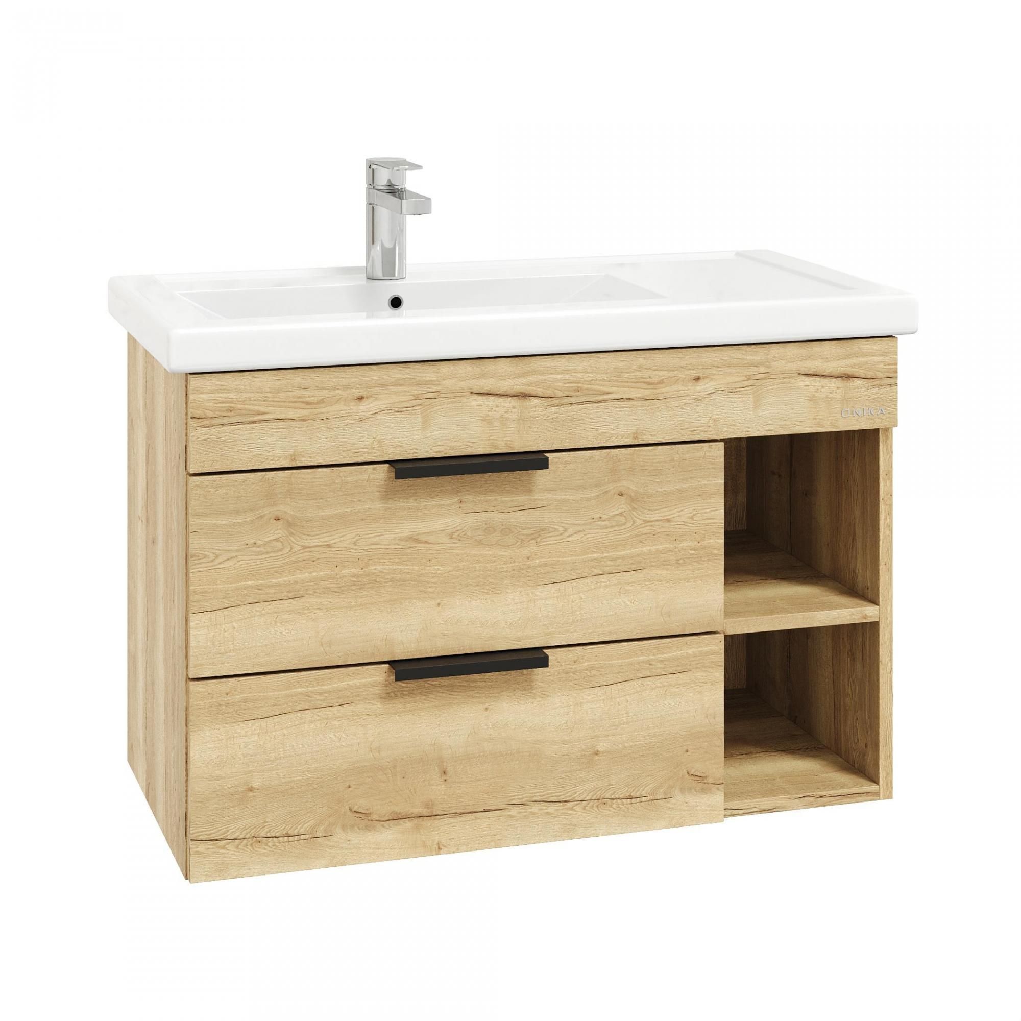 Подвесная тумба для ванной комнаты Onika Легран 80 - это сочетание насыщенного древесного декора и благородства металла: роскошная текстура и натуральный цвет дуба дают теплоту, а матовые металлические ручки добавляют урбанизма и солидности.