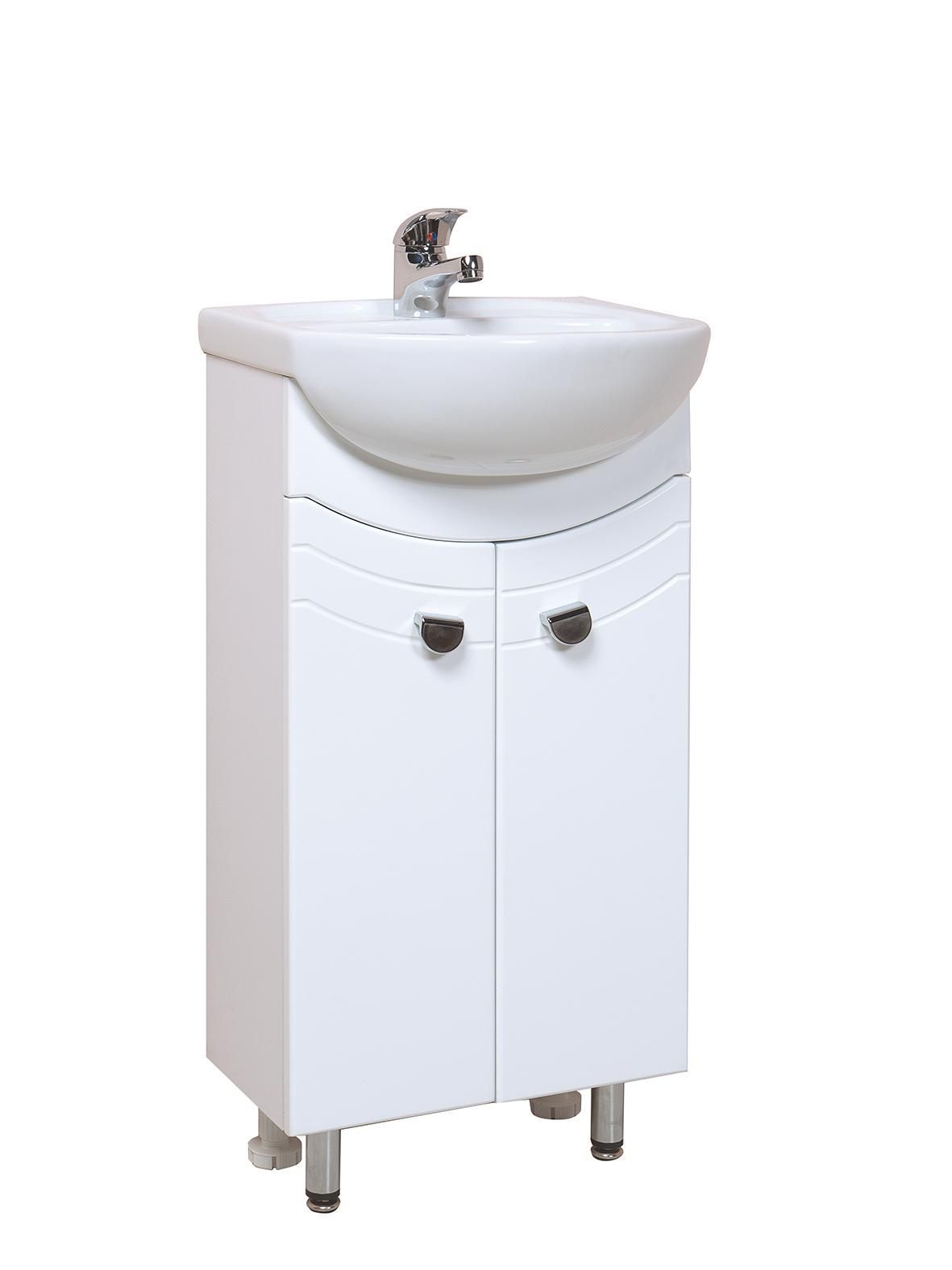 Напольная тумба под раковину для ванной комнаты Onika Манго 40 выполнена в выполнена в традиционном стиле и белом цвете: нейтральная фрезеровка по фасаду и 2 распашные двери, украшенные необычными ручками и оснащенные системой плавного закрывания.