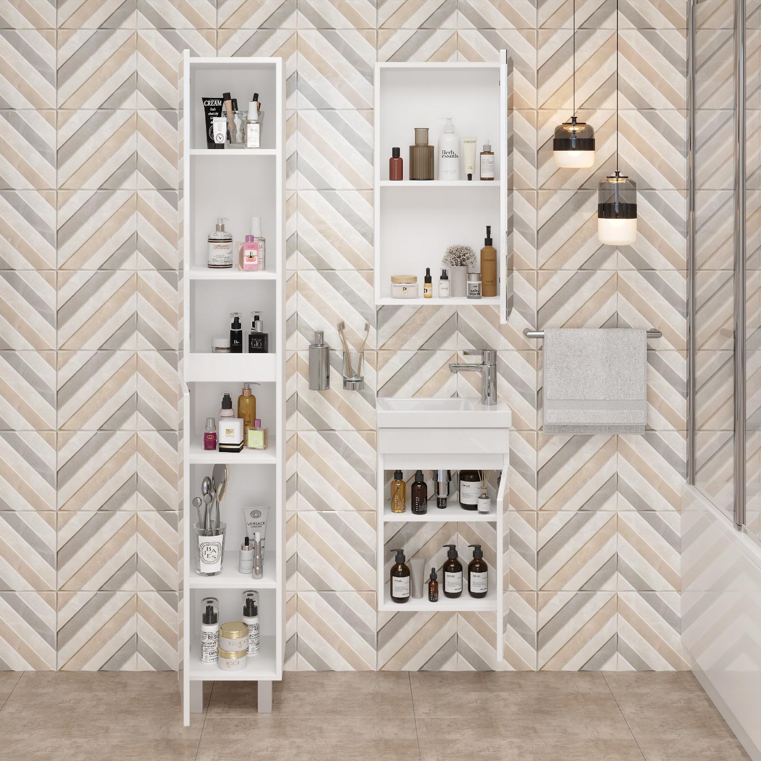 Тумба имеет белый глянцевый фасад и строгие формы без декора. За дверцей с интегрированной ручкой скрывается пространство с полкой для размещения необходимых бытовых принадлежностей.