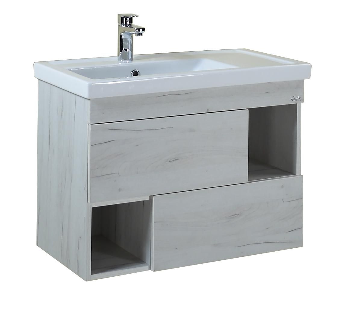 Подвесная тумба Onika Санторини 80 отражает актуальные тенденции в дизайне мебели для ванной комнаты: минимализм и геометрия фасадов, чёткость и лаконичность форм, отсутствие декора и стильный цвет белой древесины с текстурой дорогих пород.