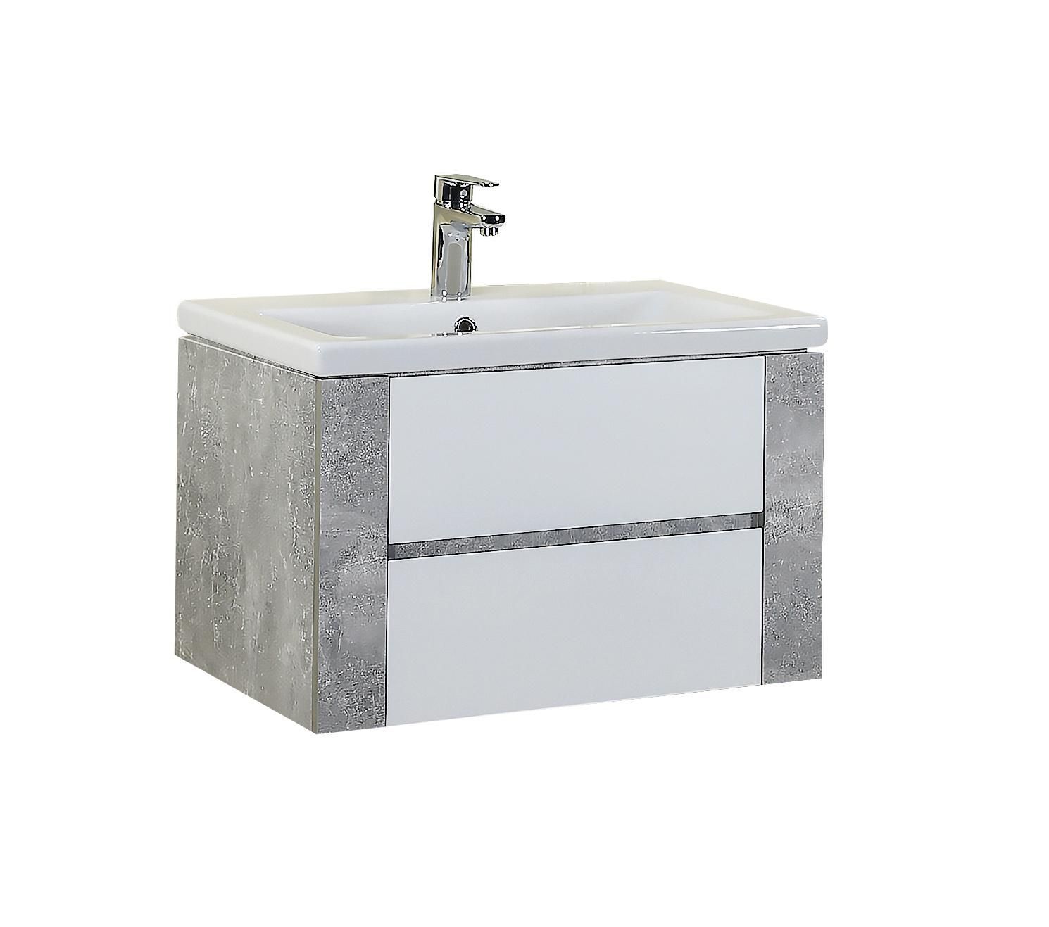 Подвесная тумба Стоун 70 отражает актуальные тенденции в дизайне мебели для ванной комнаты: минимализм и геометрия фасадов, чёткость и лаконичность форм, отсутствие декора и стильный цвет выбеленного бетонного покрытия.