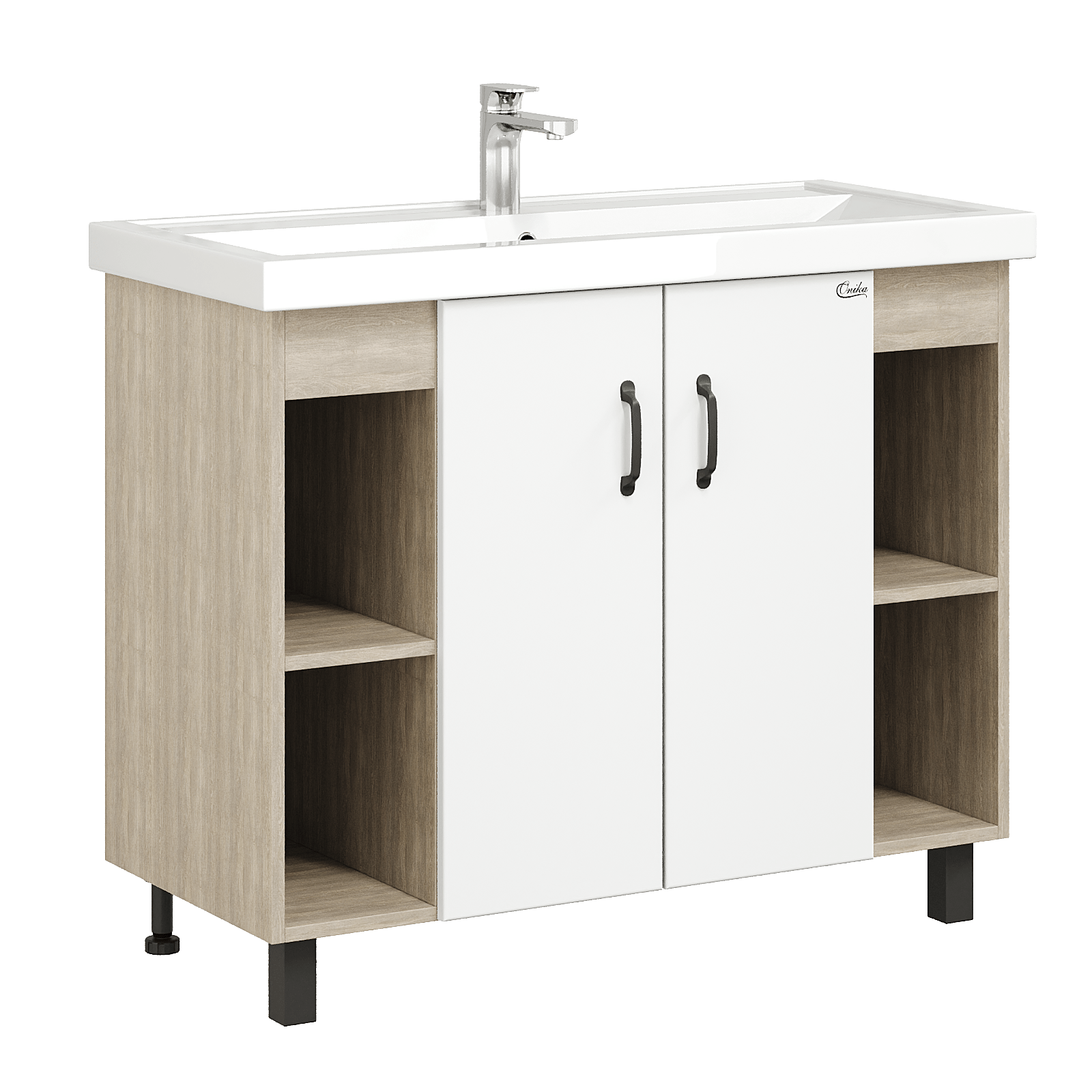 Открытые полки по бокам от основного отделения обеспечивают быстрый доступ к часто используемым аксессуарам, а пространство за распашными дверцами с доводчиками по центру тумбы, станет удобным местом для хранения различных бытовых принадлежностей.