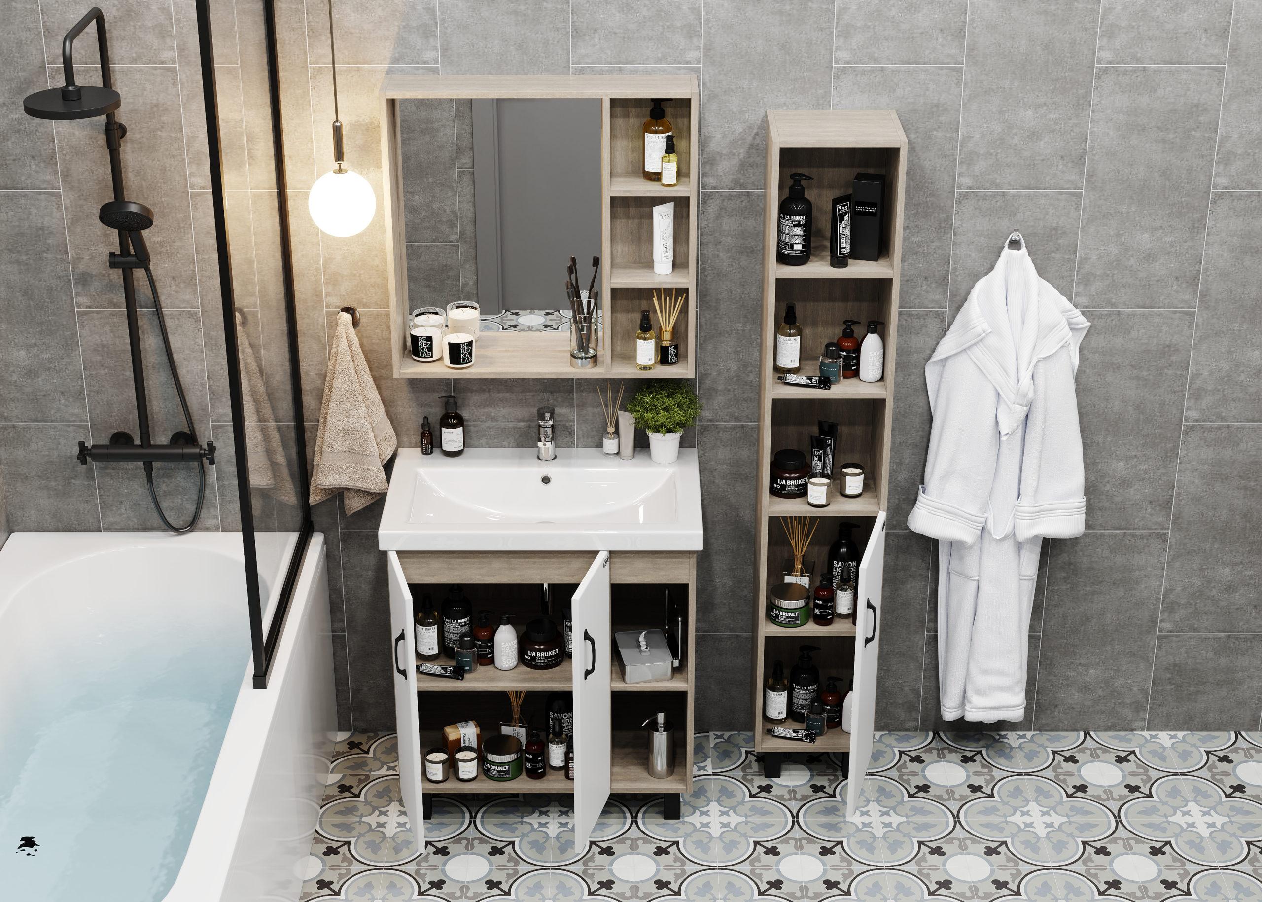 В тумбе Onika Тимбер 70 удачно сочетаются контрастные цвета и фактуры: белый матовый фасад с покрытием SoftTouch, корпус цвета дуба с роскошной текстурой, черная матовая металлическая фурнитура.