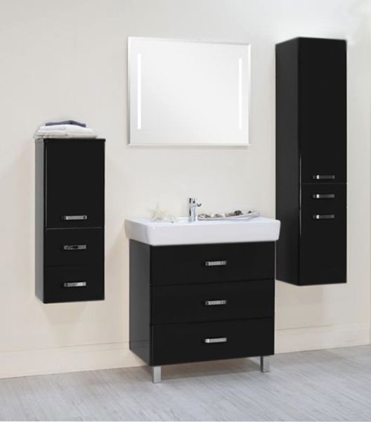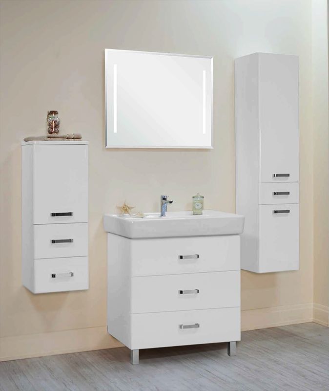 Тумба под раковину Акватон Америна 80 М 1A169101AM010 с тремя выдвижными ящиками и изящными глянцевыми опорами.
