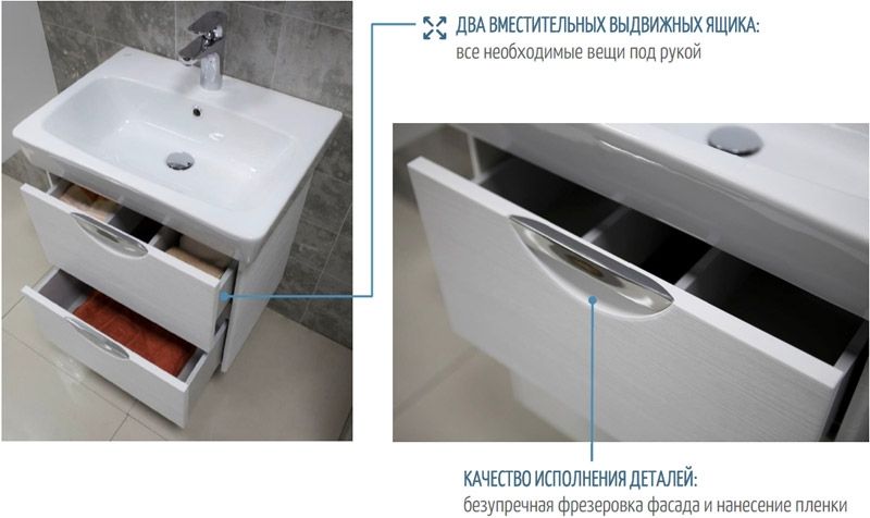- Фасад и корпус тумбы выполнены из МДФ/ЛДСП. Материал покрыт пленкой импортного производства (Италия, Германия). Безупречная фрезеровка фасада и нанесение пленки, что гарантирует высокую влагостойкость и прочность.