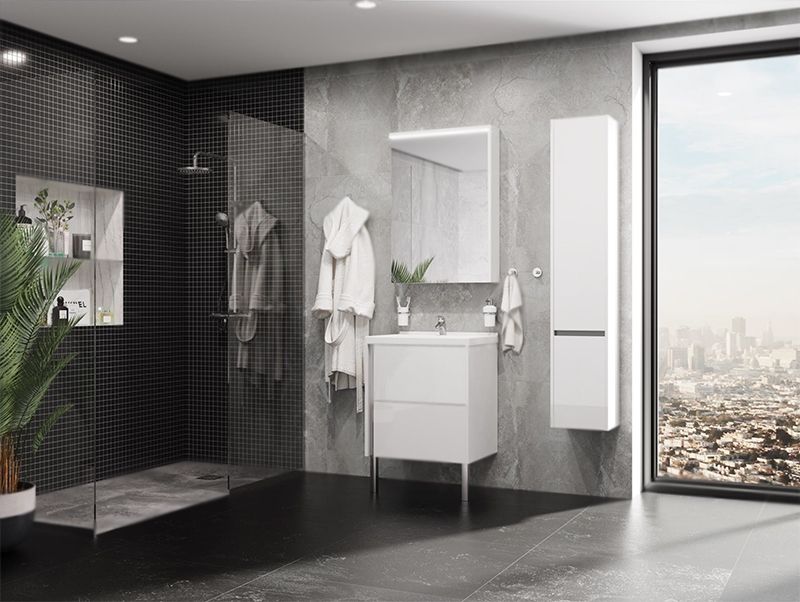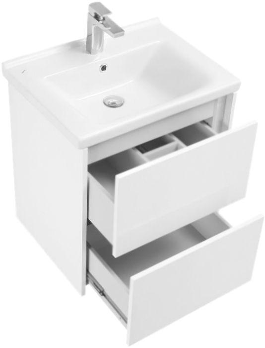 Подвесная тумба под раковину Акватон Стоун 60 1A231401SXC80 с двумя выдвижными ящиками. Предназначена для использования в ванных комнатах с повышенной влажностью. Минималистичный стиль: четкая и лаконичная геометрия, встроенный в фасад анодированный алюминиевый профиль вместо традиционной лицевой фурнитуры, отсутствие выступающих деталей.