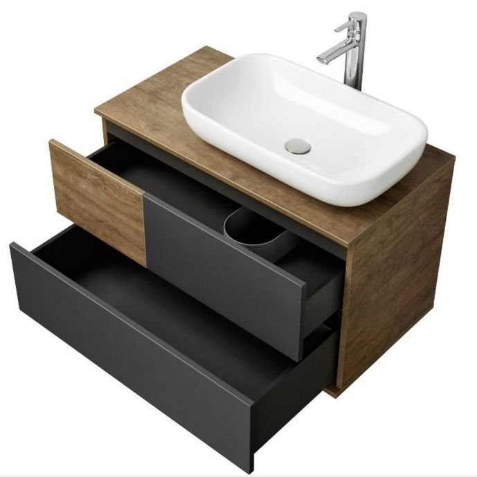 Тумба под раковину Акватон Терра 85 1A247201TEKA0. Гармоничное сочетание современного дизайна и древесной текстуры. Текстуры на тумбе расположены асимметрично: столешница, корпус и вставка на верхнем ящике - влагостойкое ДСП цвета дуб кантри, фасады ящиков - матовая серая пленка антрацит.