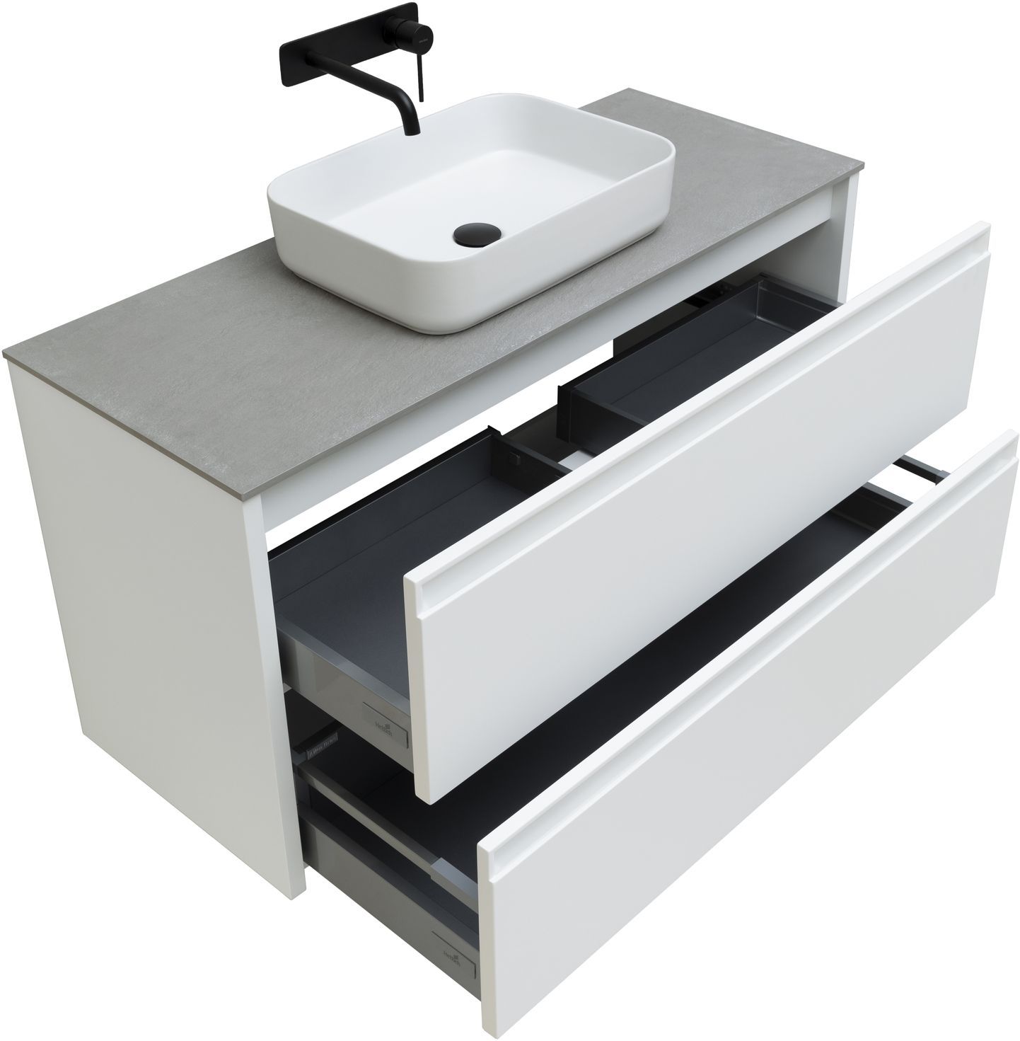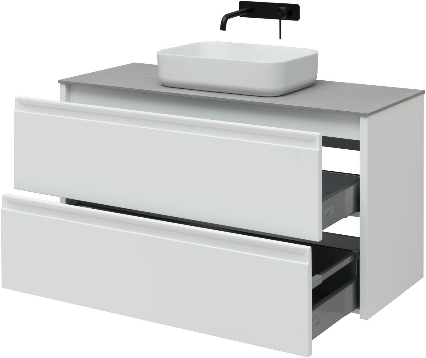 Выдвижные ящики с металлическими боковыми стенками в цвете серый металлик.