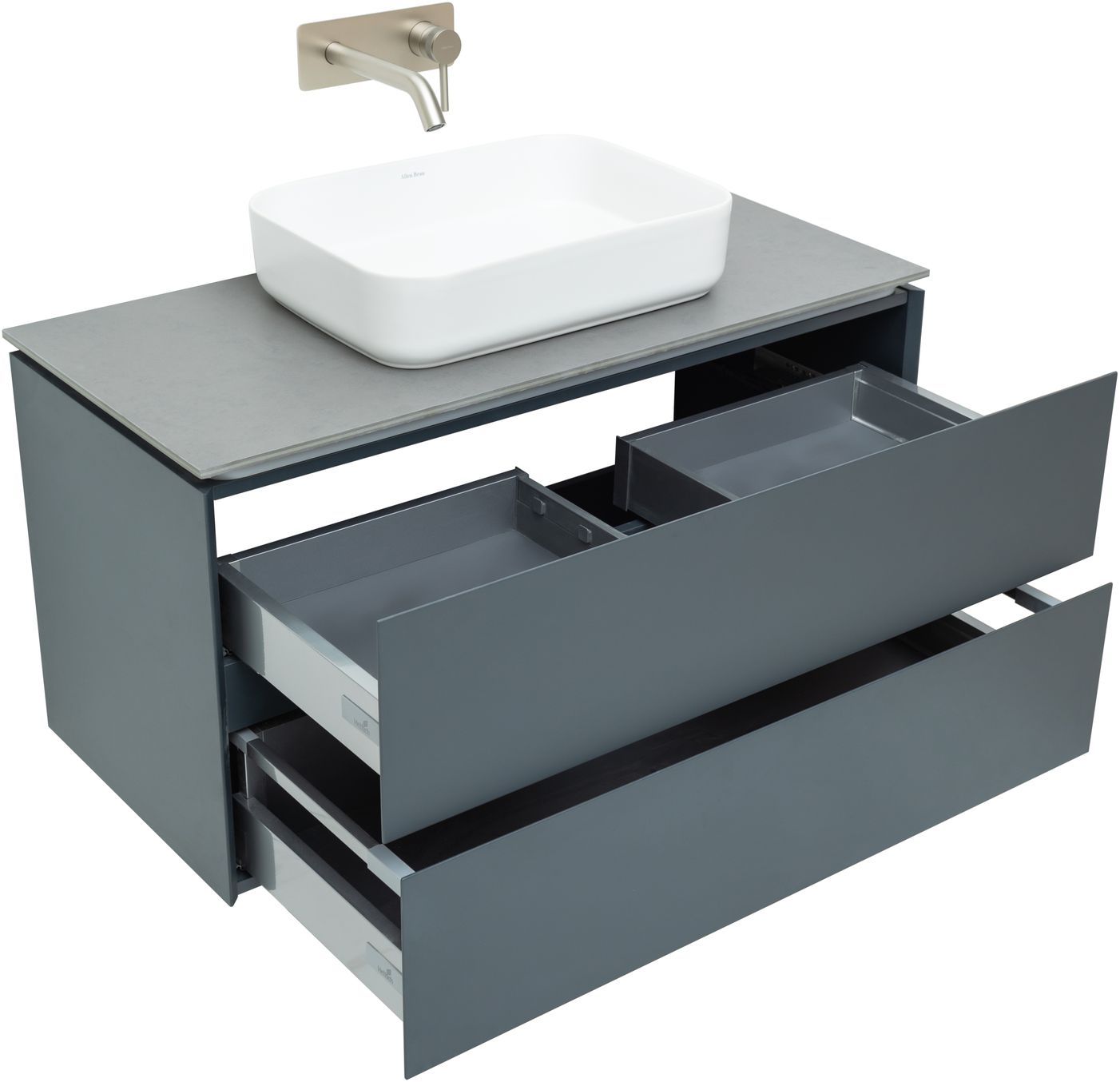 Выдвижные ящики с металлическими боковыми стенками в цвете серый металлик.