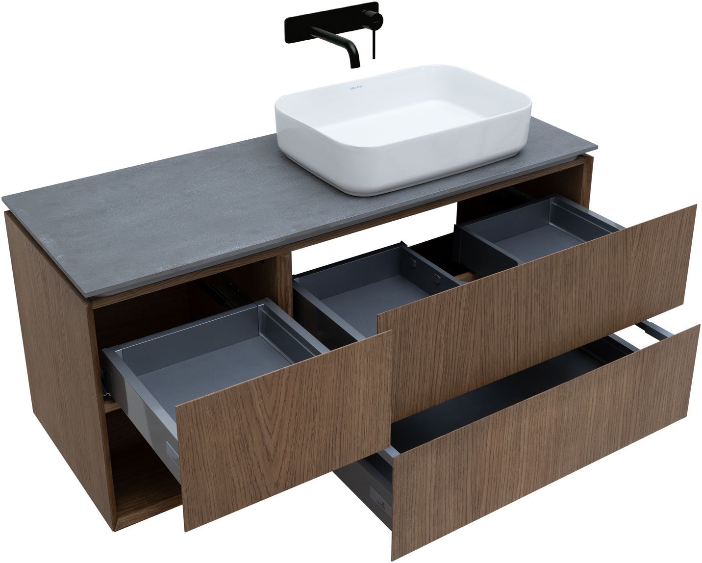 Выдвижные ящики с металлическими боковыми стенками в цвете серый металлик.