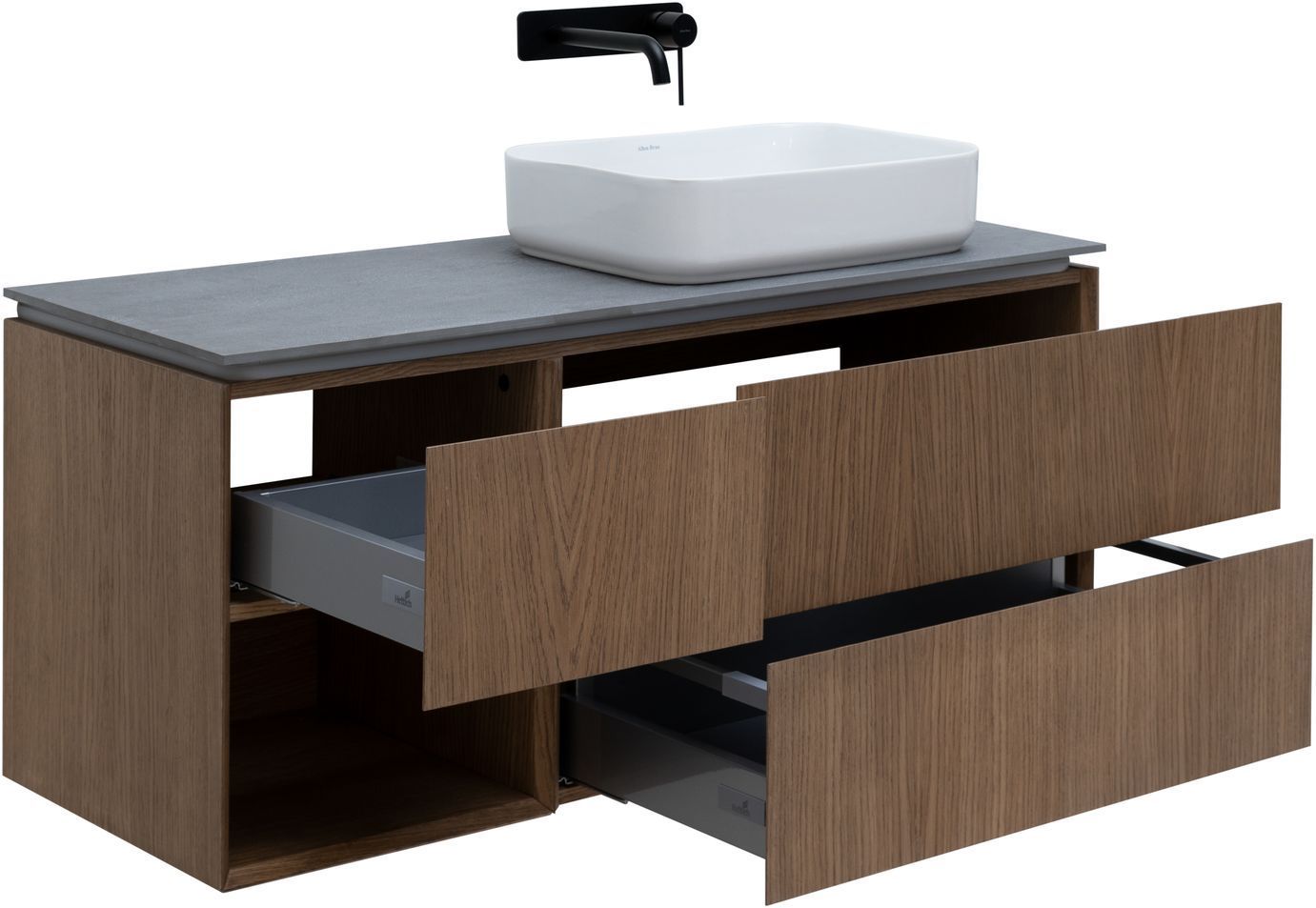 Плавное закрывание ящиков, полное выдвижение, прочное дно (толщина 16 мм), нагрузка до 30 кг.