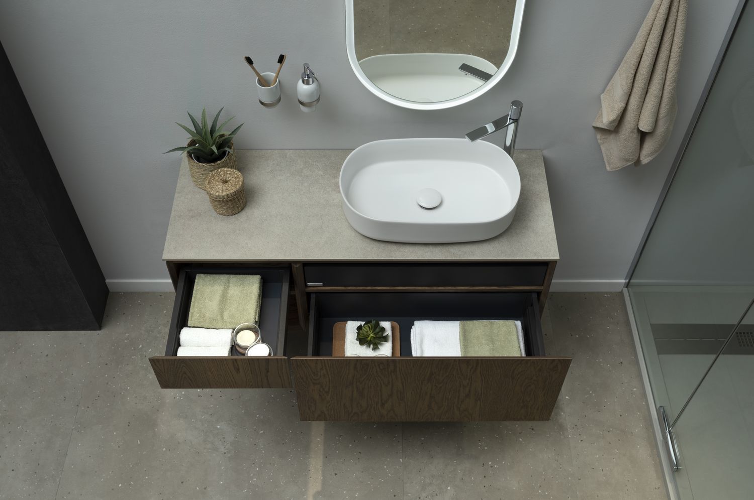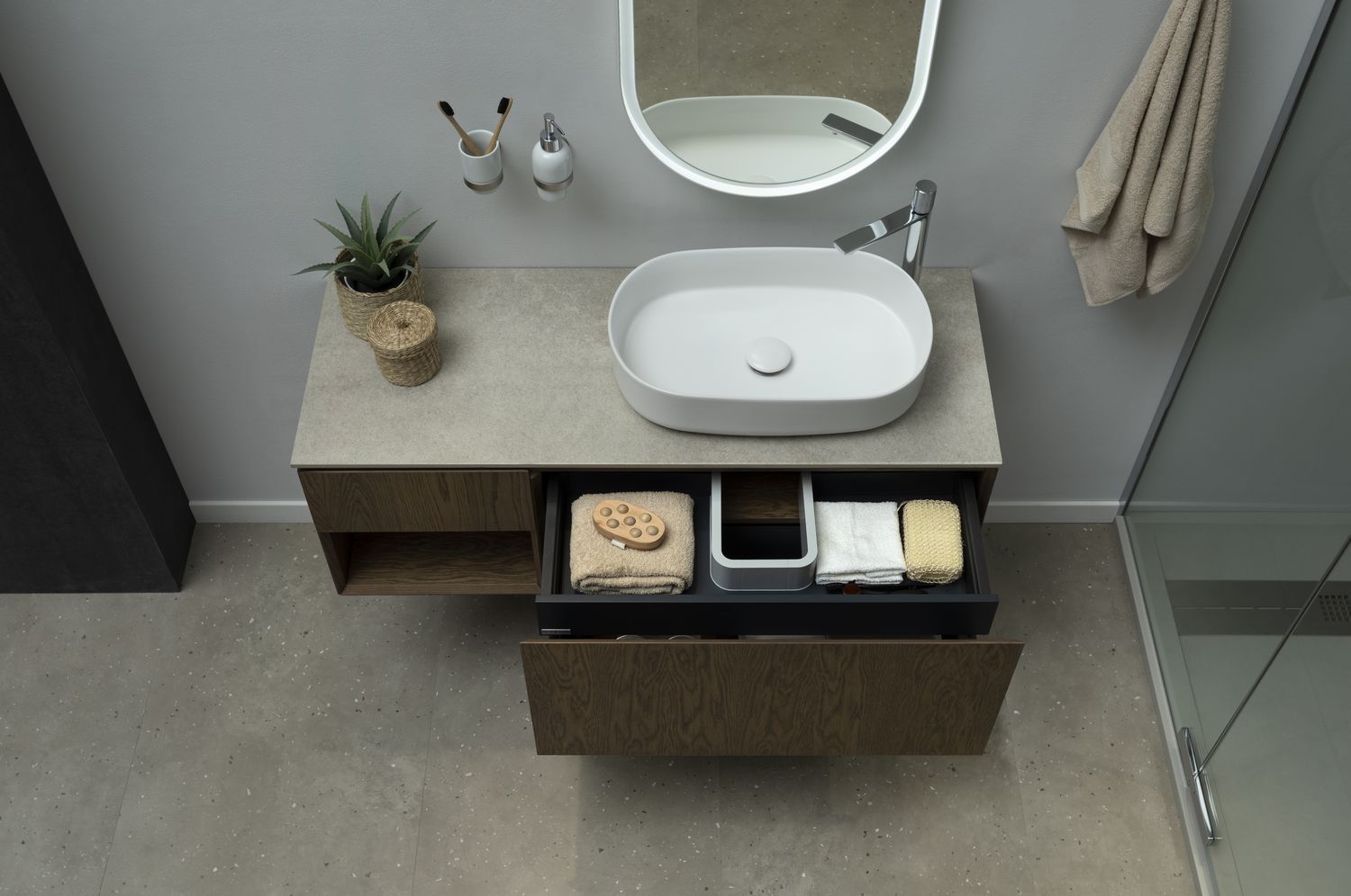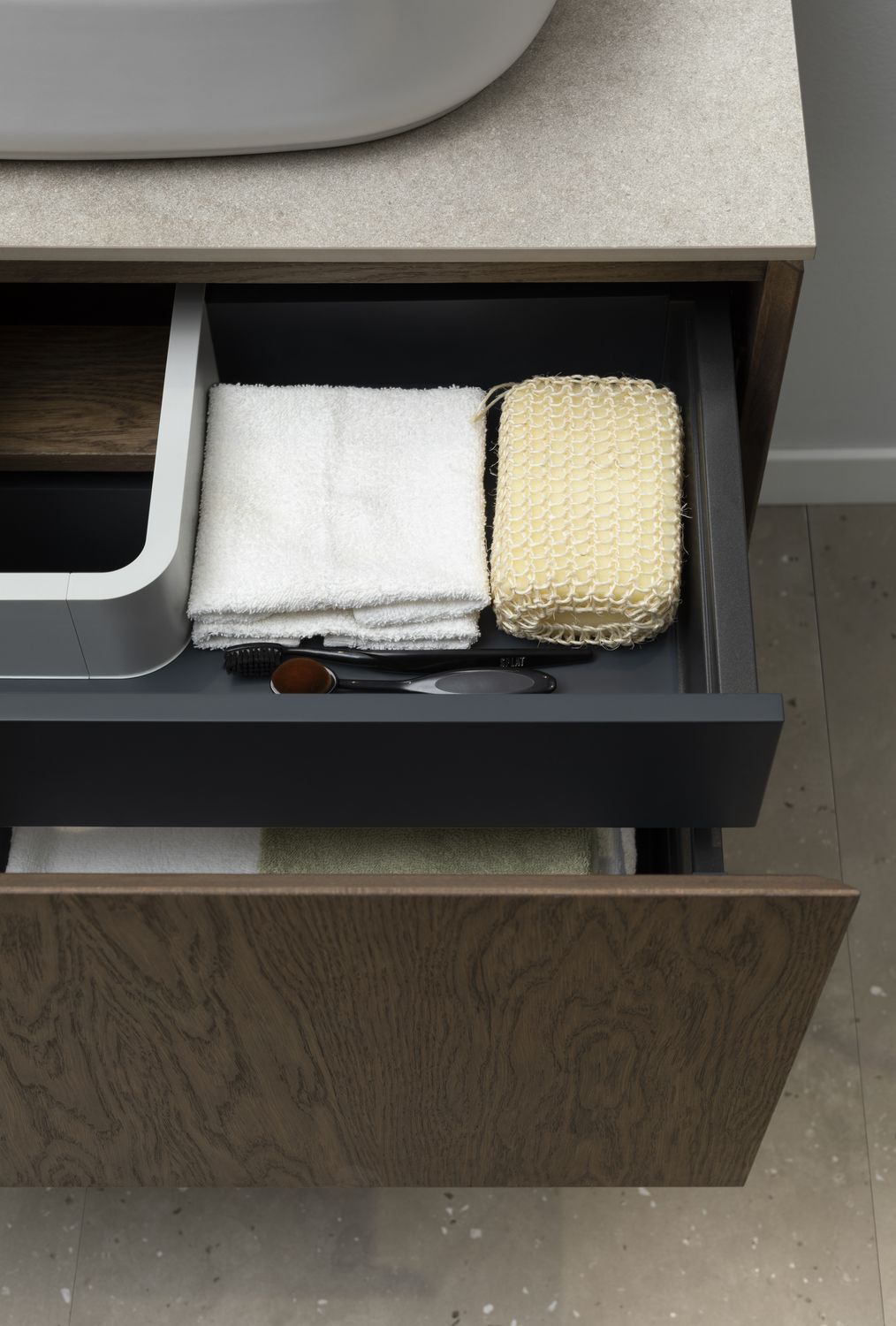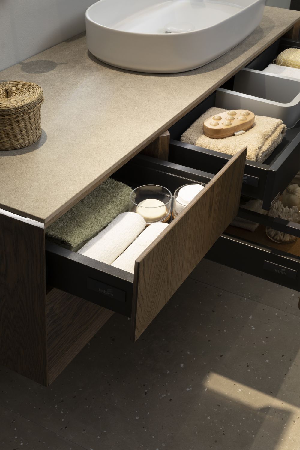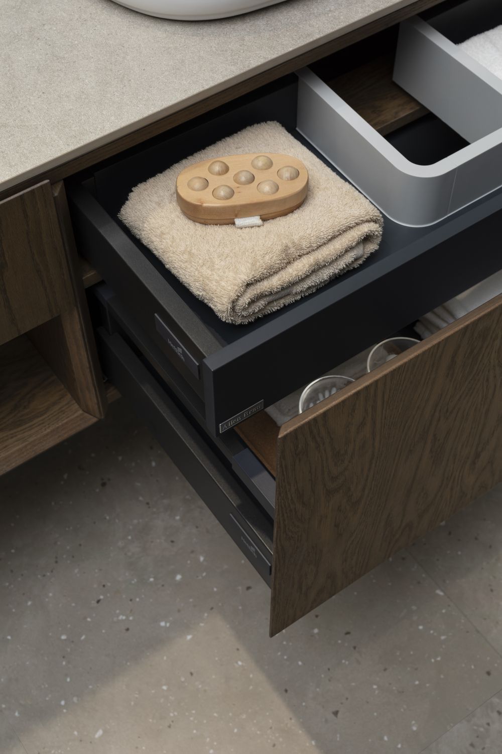 Выдвижные ящики с металлическими боковыми стенками в цвете серый металлик.