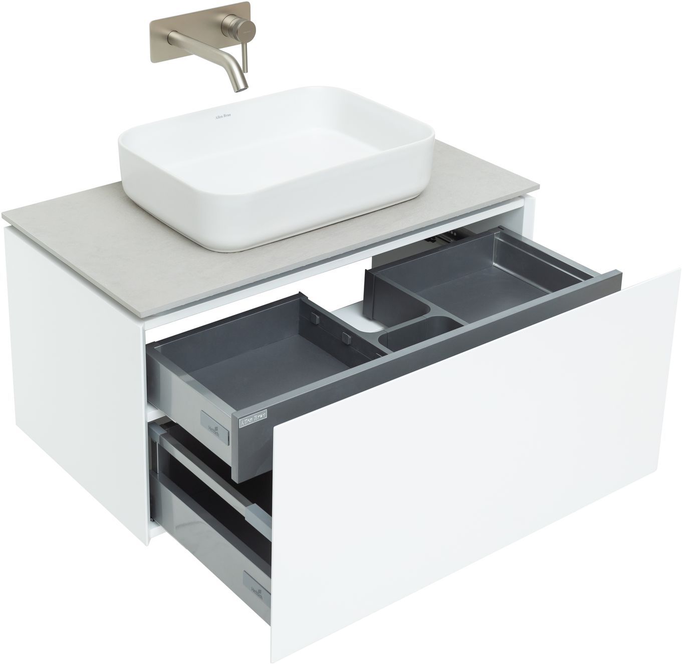 Выдвижные ящики с металлическими боковыми стенками в цвете серый металлик.