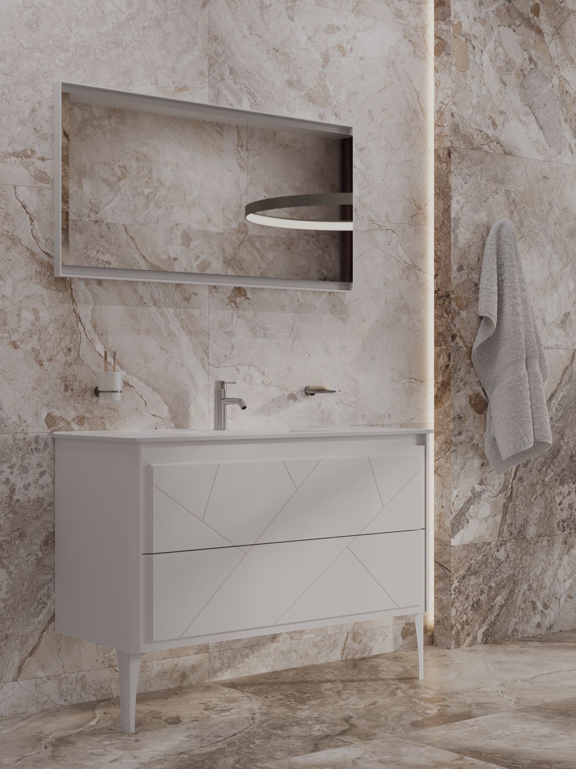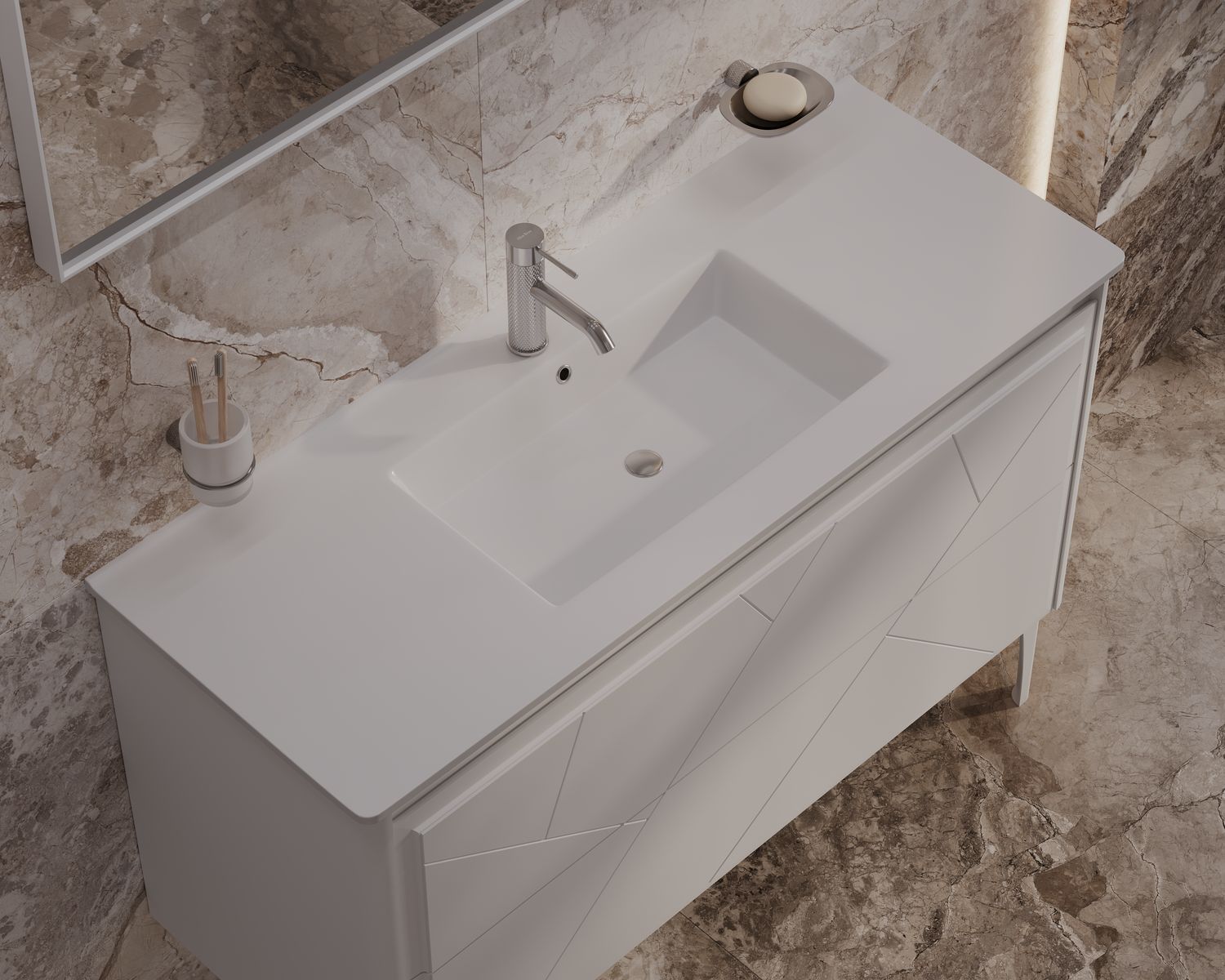 Корпус и фасады: выполнены из МДФ с матовой эмалью, что обеспечивает долговечность и устойчивость к влаге.