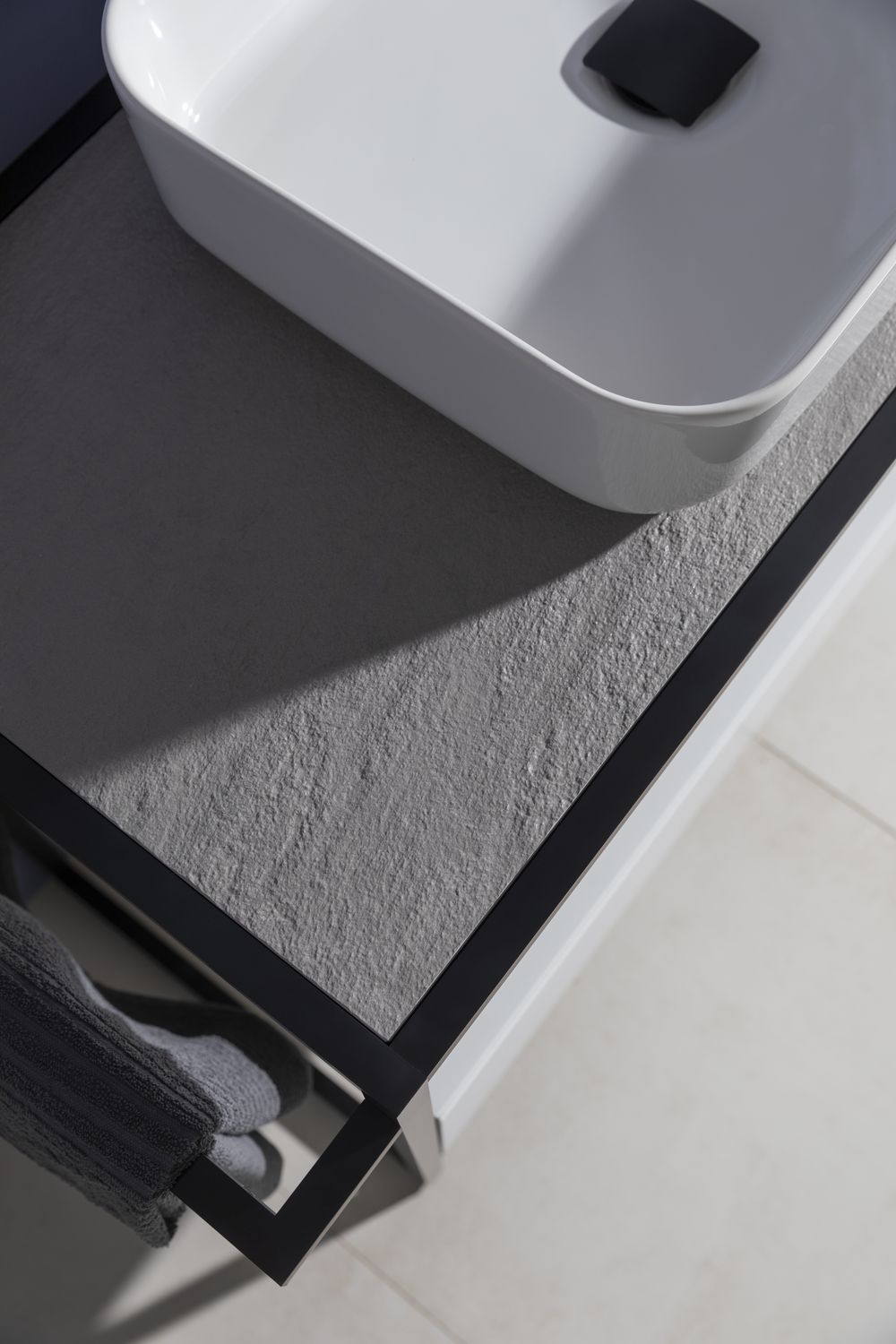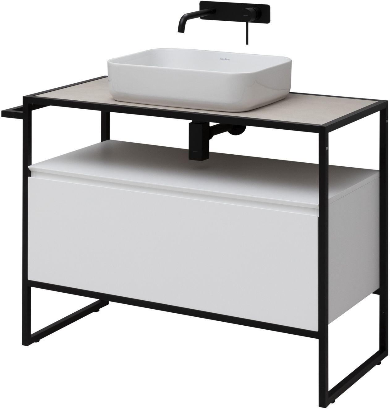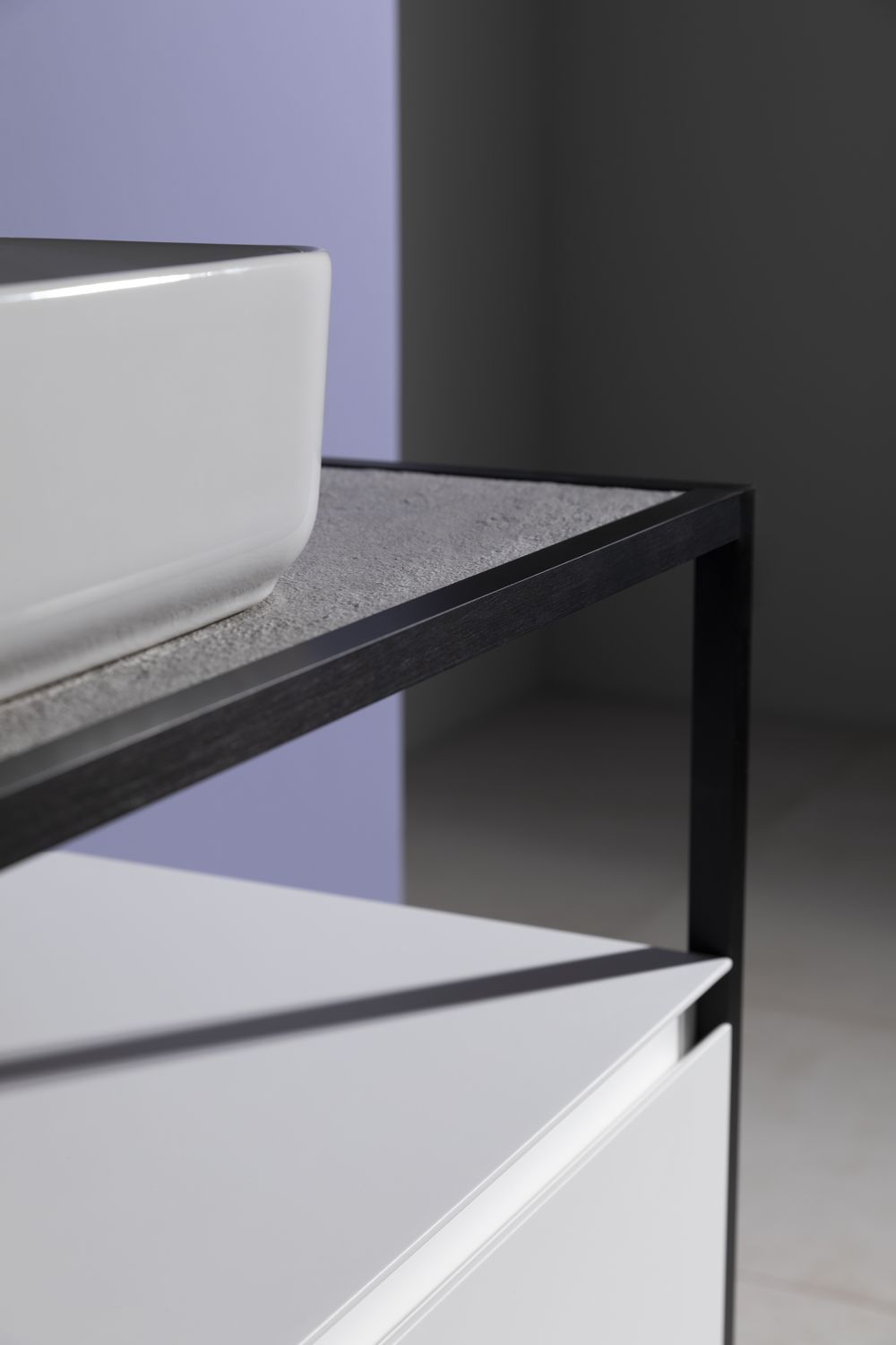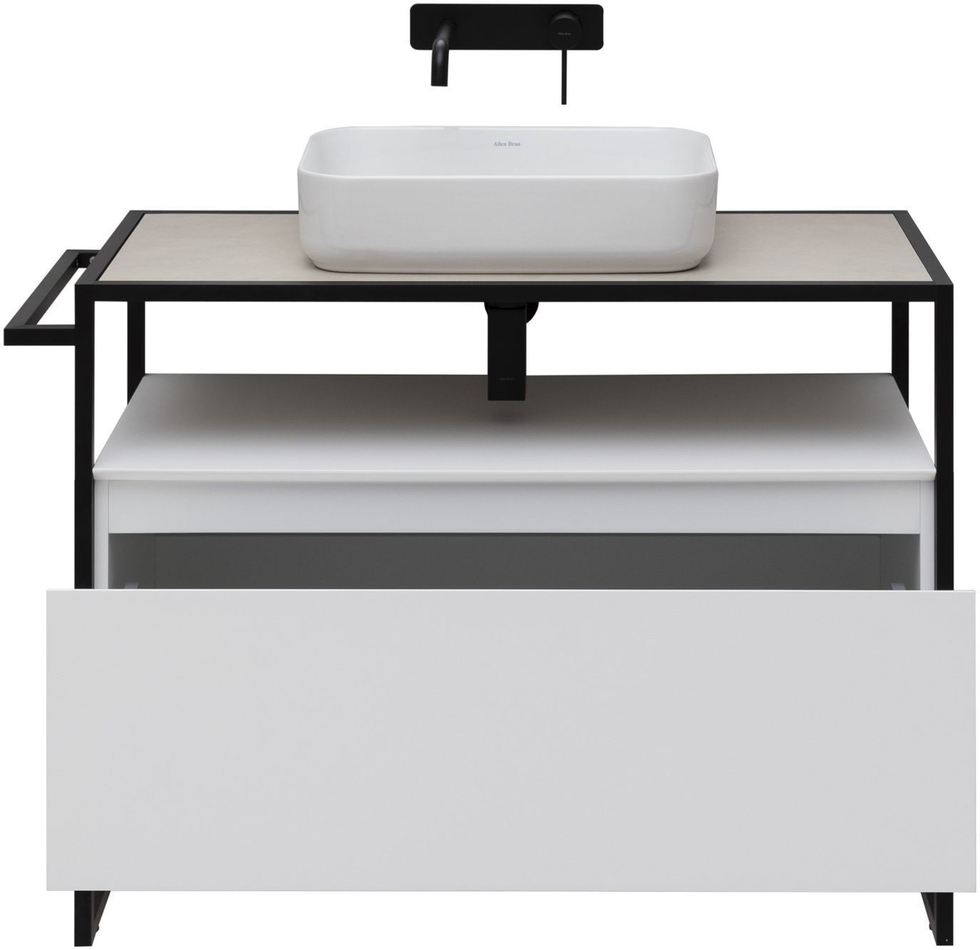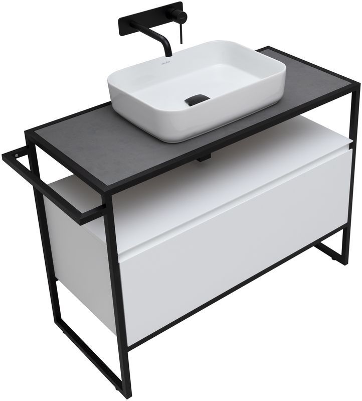 Стильные каркасы тумб и пеналов выполнены из металла, имеют брашированную поверхность с нанесением цвета путем анодирования.