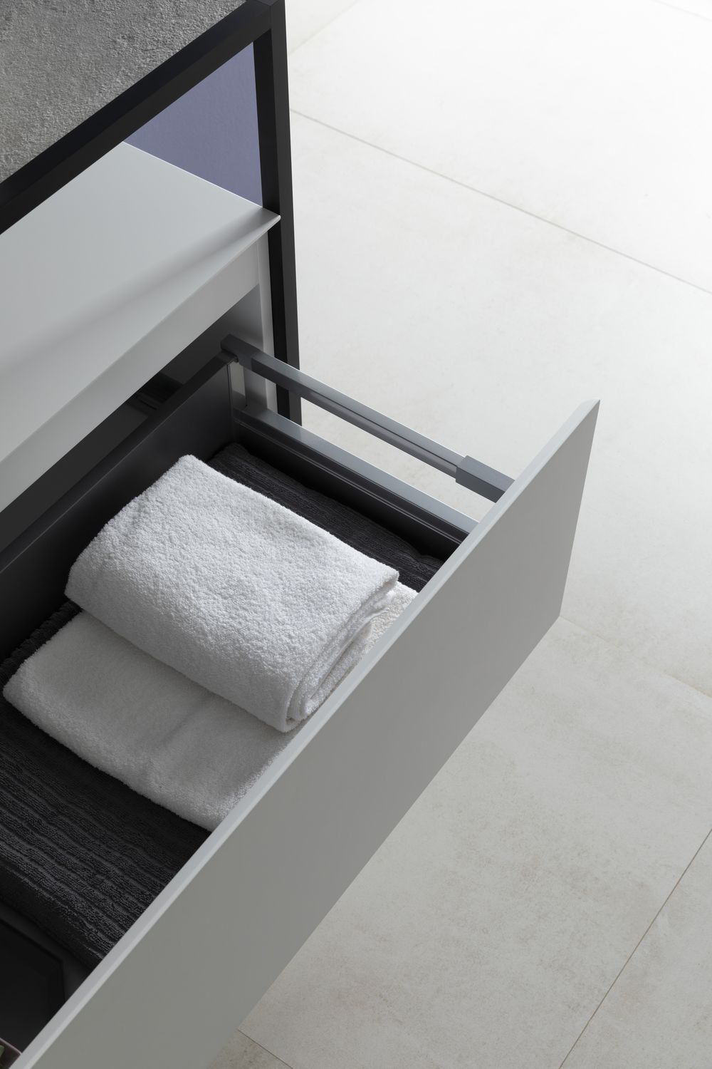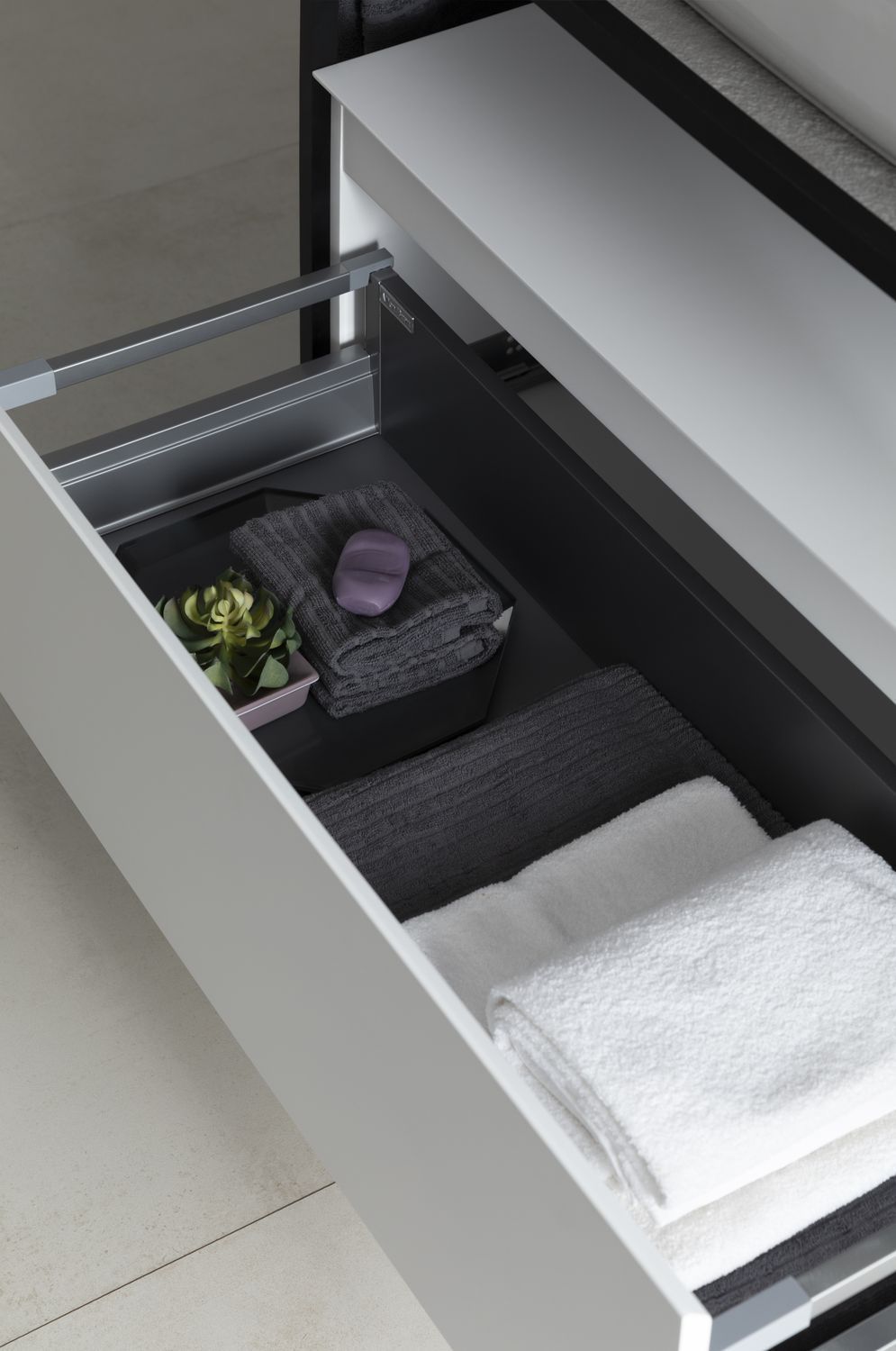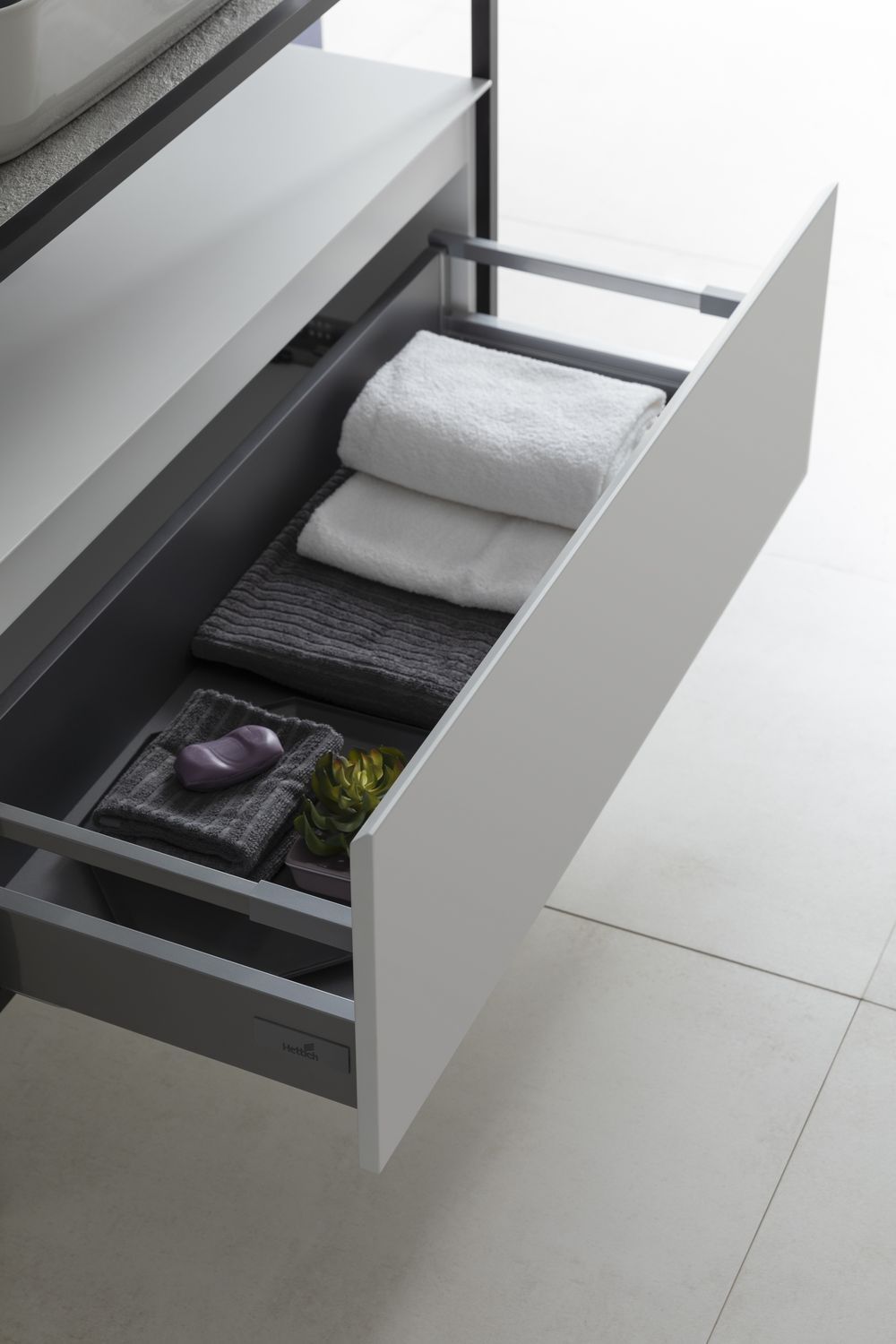 Выдвижные ящики с металлическими боковыми стенками в цвете серый металлик.