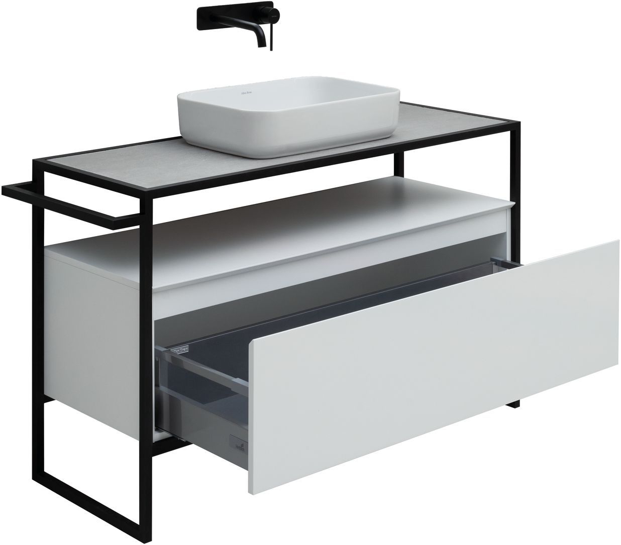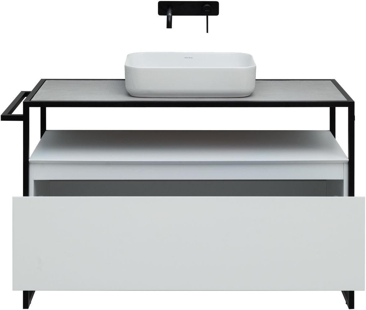 Стильные каркасы тумб и пеналов выполнены из металла, имеют брашированную поверхность с нанесением цвета путем анодирования.