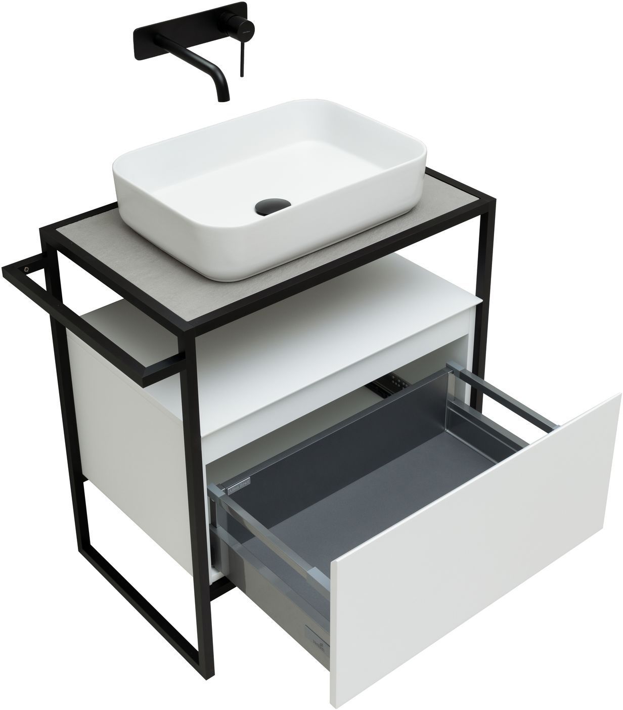 Выдвижные ящики с металлическими боковыми стенками в цвете серый металлик.