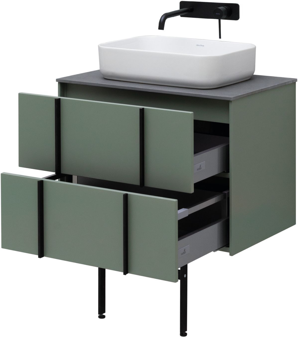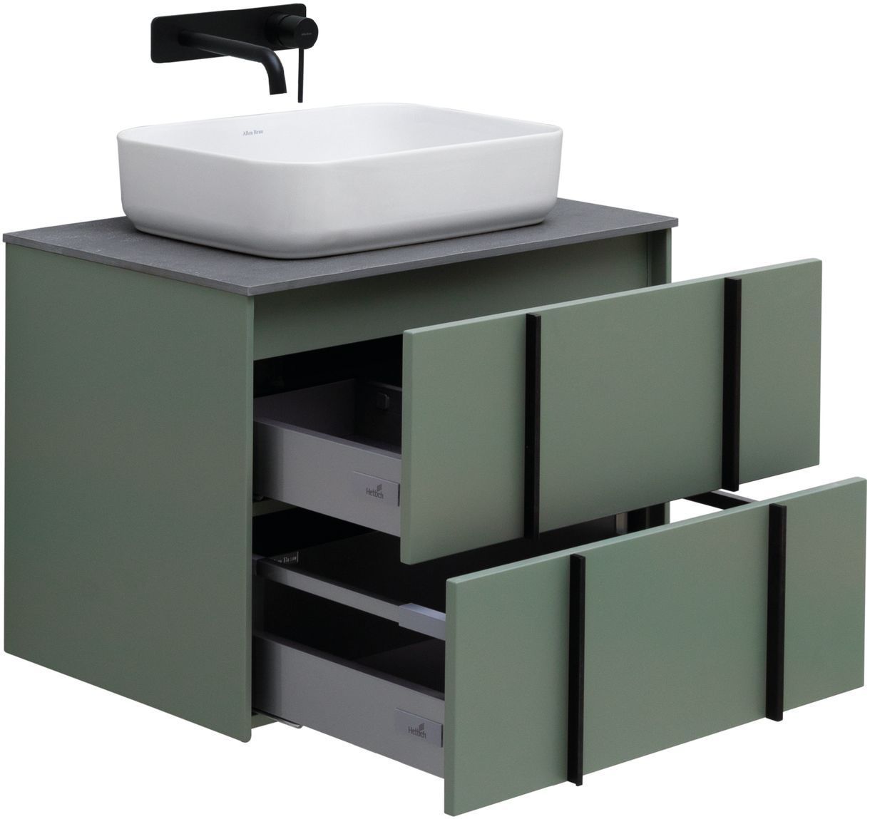 Выдвижные ящики с металлическими боковыми стенками в цвете серый металлик.