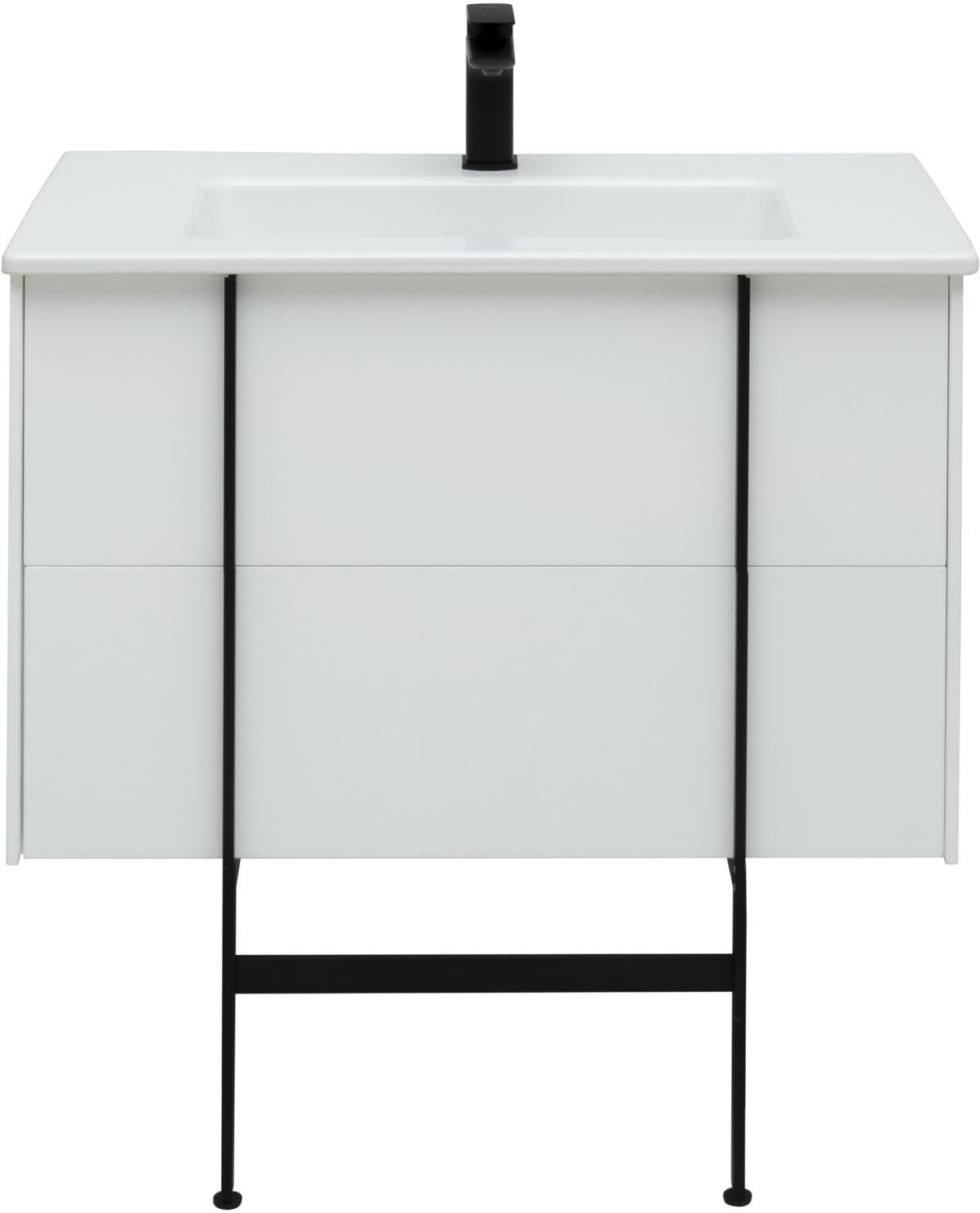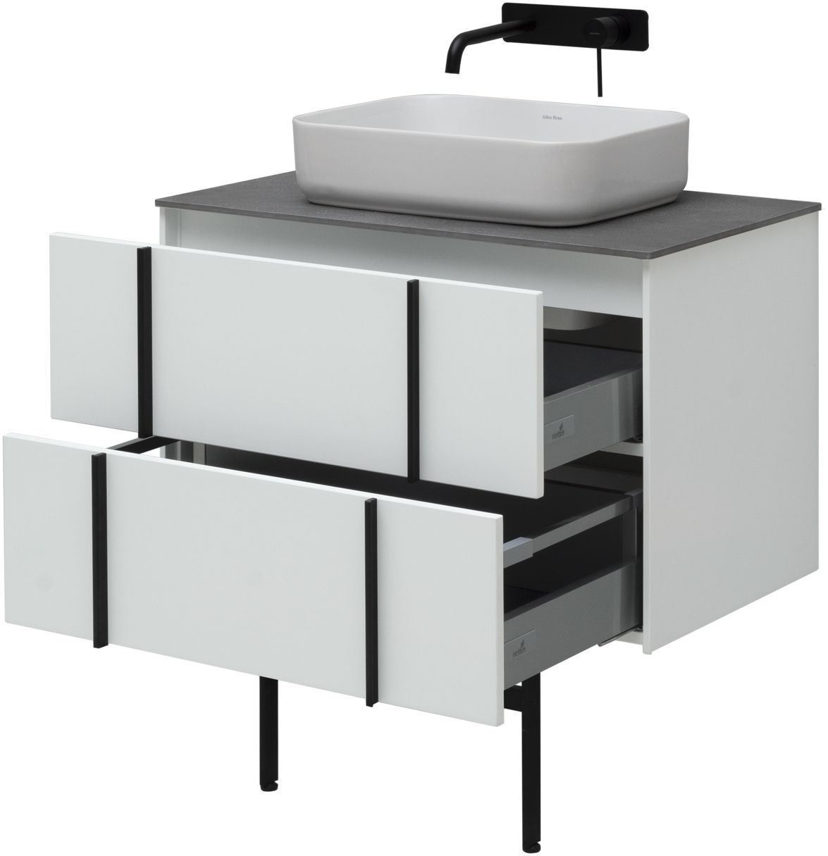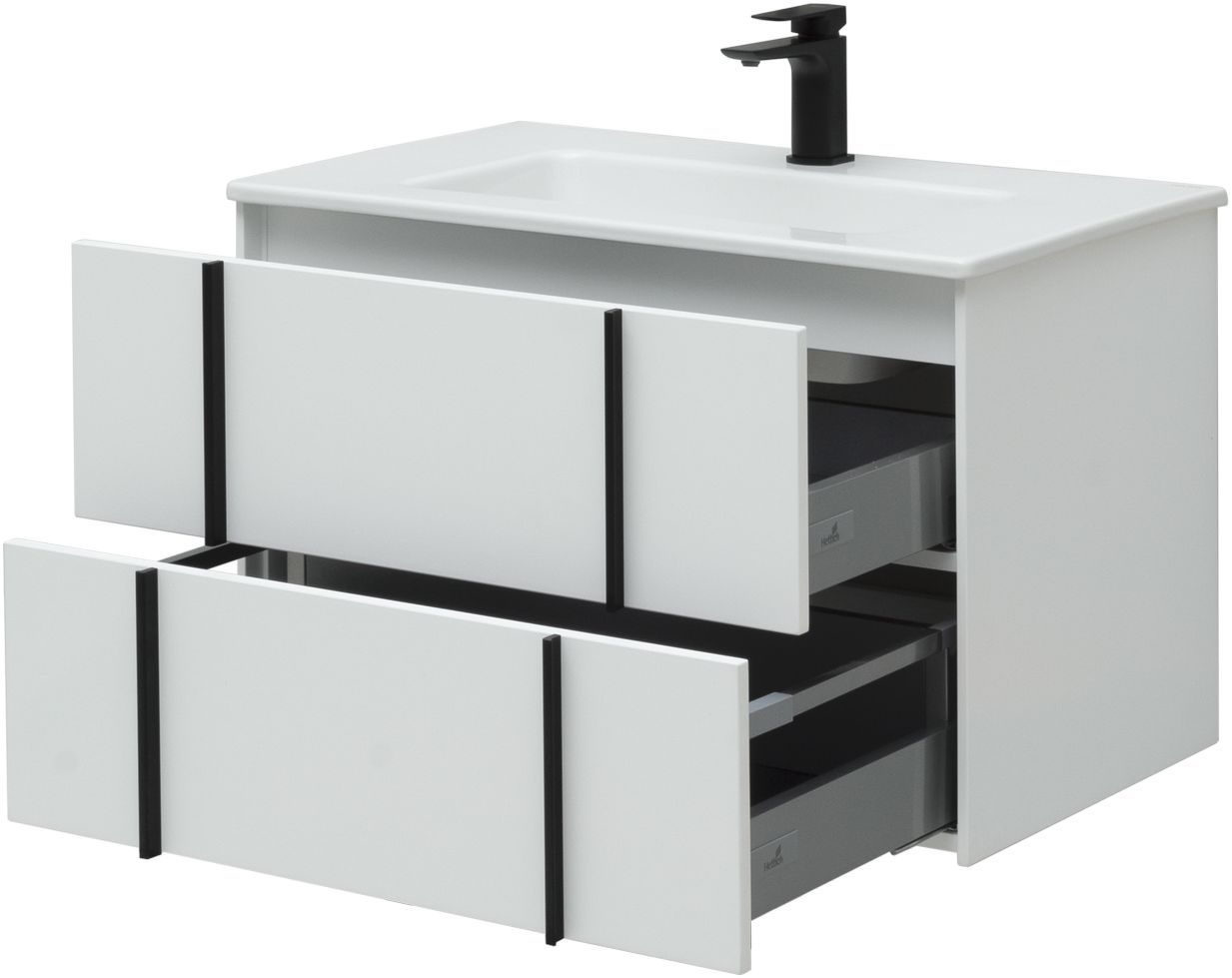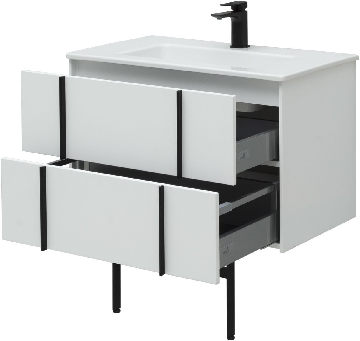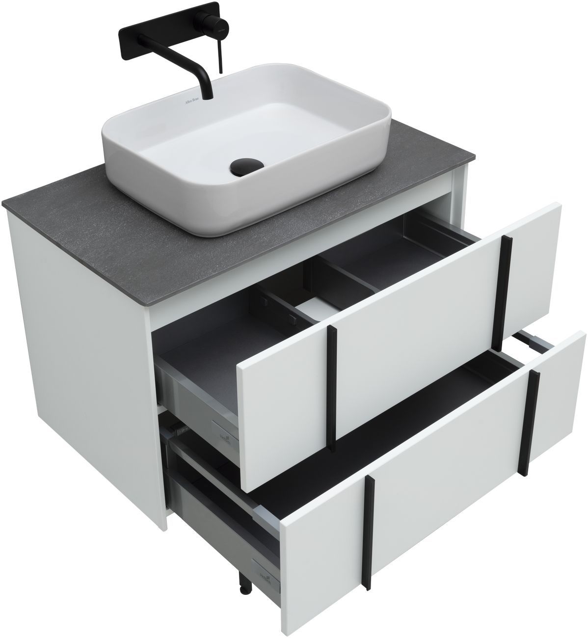 Тумбы оснащены специальной пластиковой рамой, которая надежно защищает вырез под сифон, служит органайзером и позволяет закрепить дополнительный набор контейнеров для хранения.