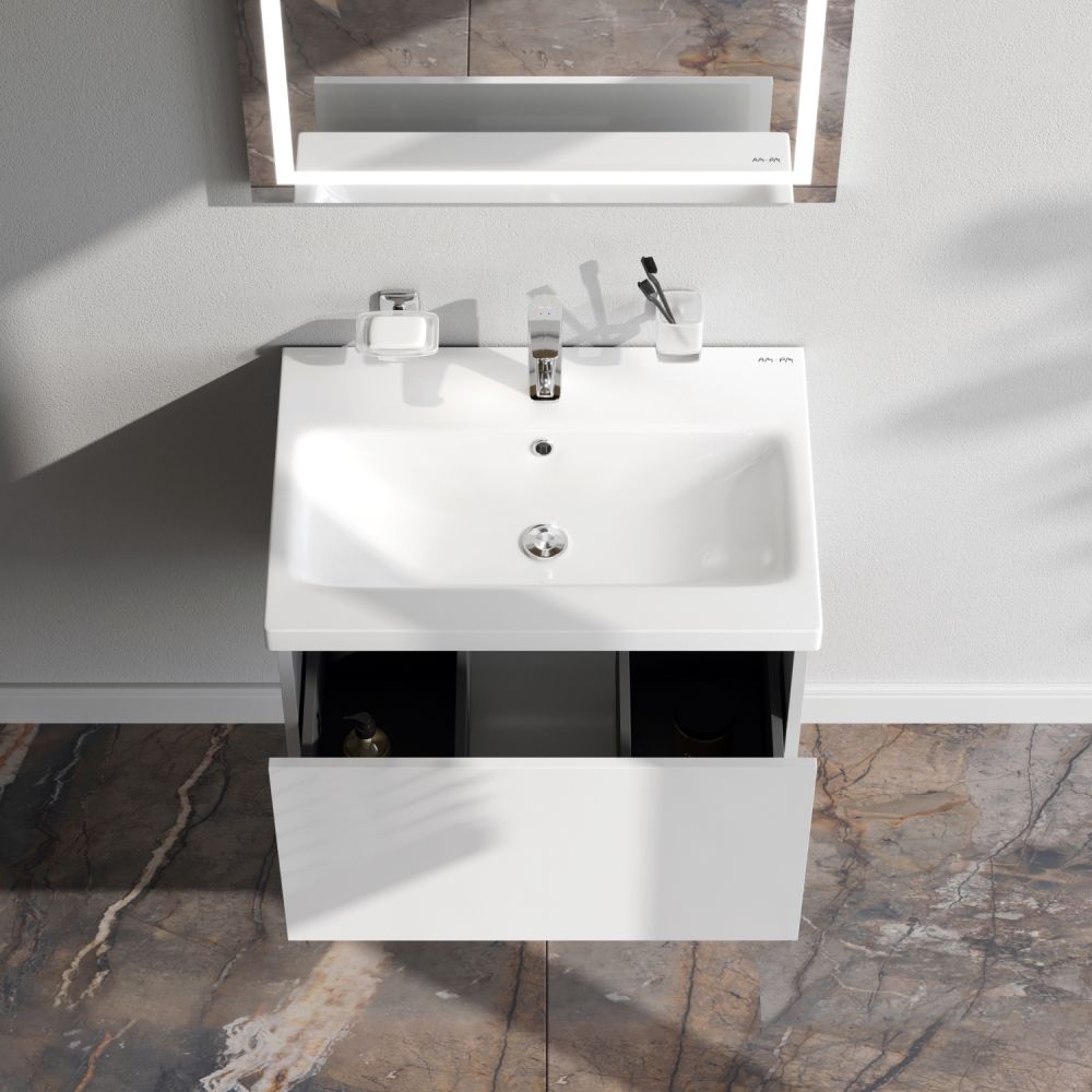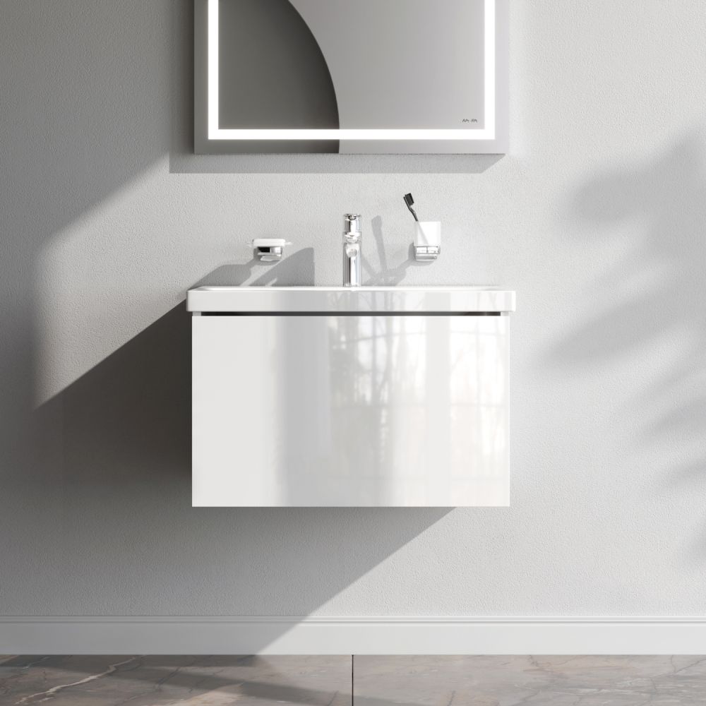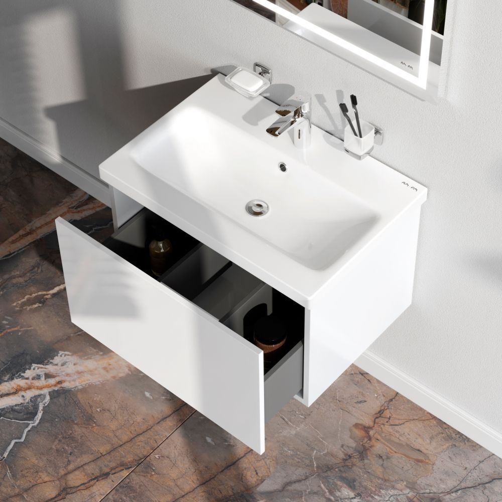 Тумба под раковину AM PM Gem 60 подвесная, с одним выдвижным ящиком. Хотите выделиться при ограниченном бюджете? Трендовый дизайн мебели для ванной комнаты Gem не уступает комплектам по гораздо более высокой цене. Нужно больше места для хранения? Добавьте открытую нишу, доступную во всех трех дизайнерских расцветках, чтобы создать свою комбинацию! Впервые в доступном сегменте: фурнитура push-to-open последнего поколения. Экологически чистые и удивительно долговечные полиакриловые эмали – специальная технология покраски в 7 слоев превосходит технологию нанесения автоэмали у ведущих немецких марок и обеспечивает насыщенный цвет в течение всего срока службы (от 10 лет).