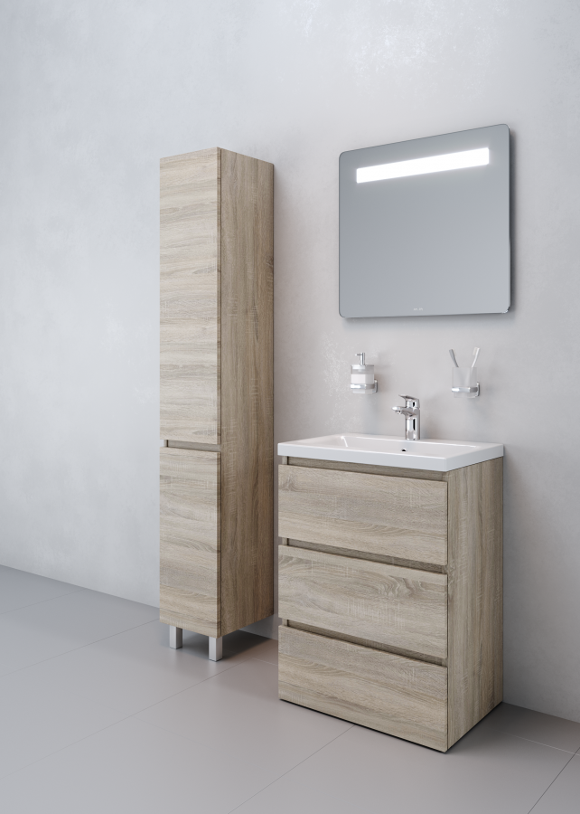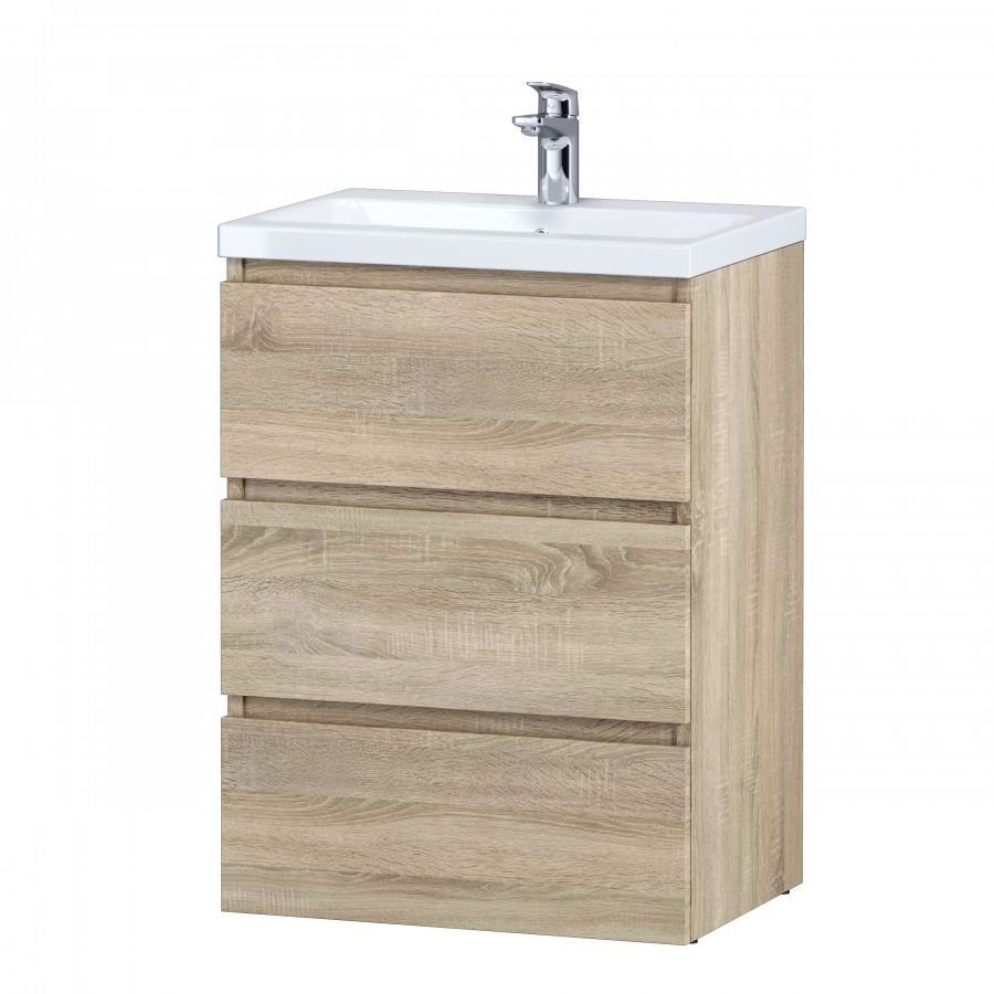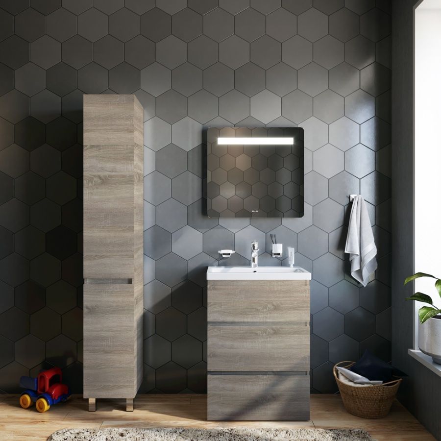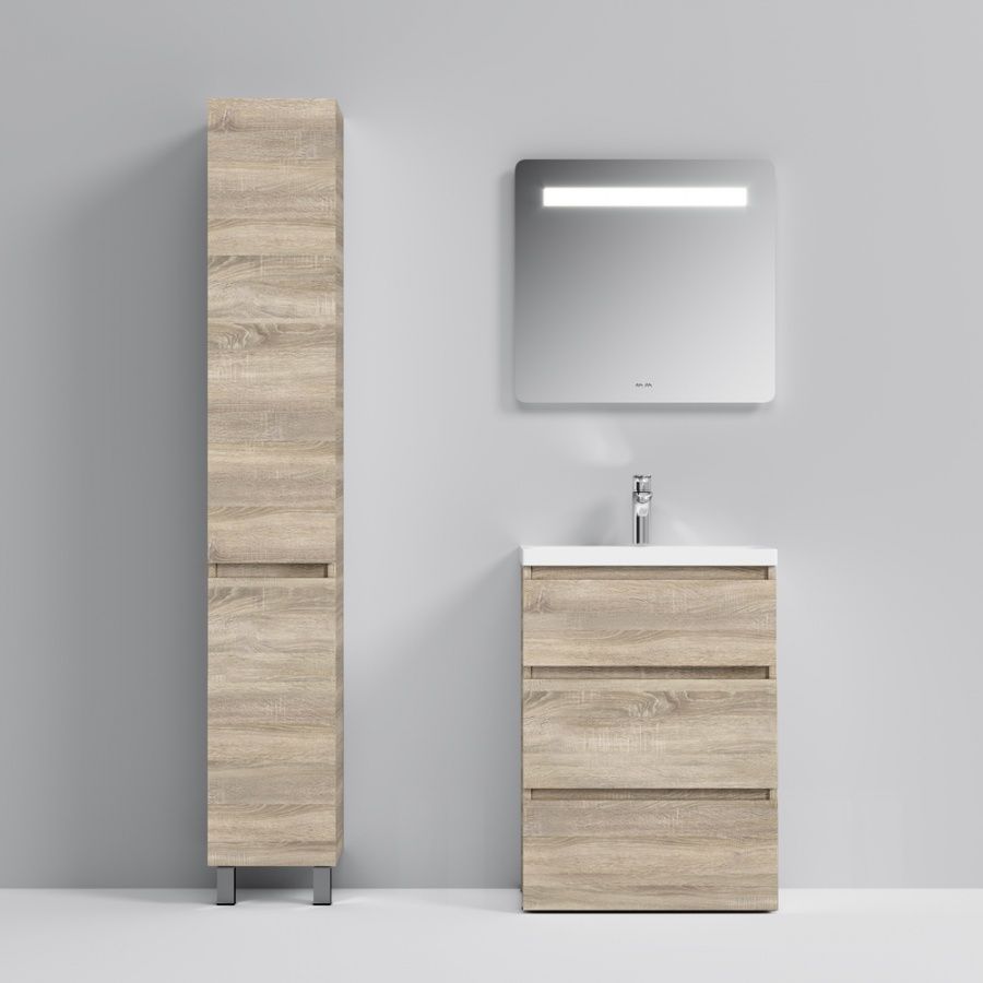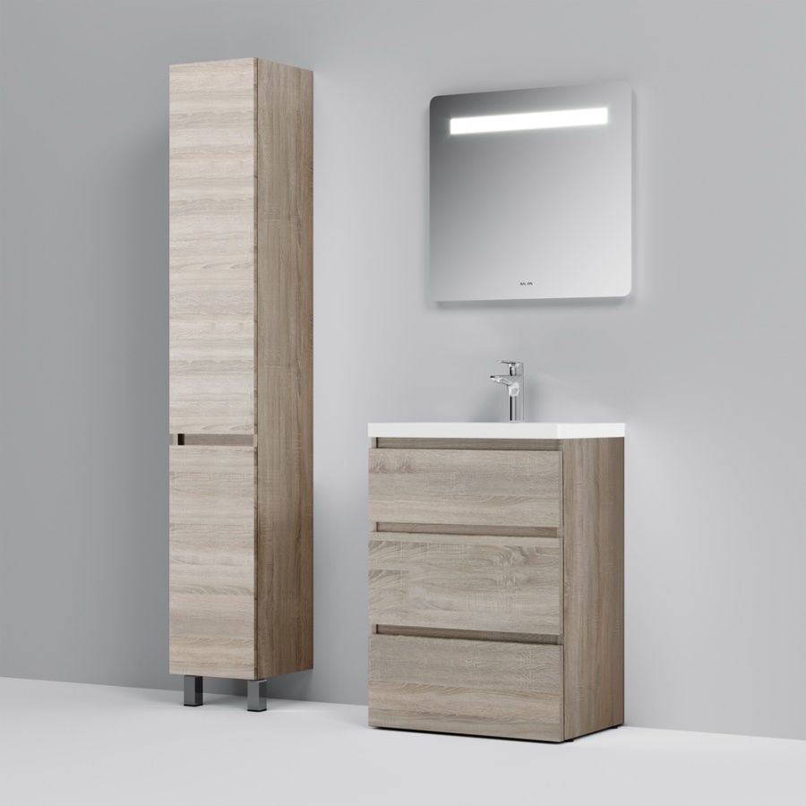 Тумба под раковину AM PM Gem S 60 с выдвижными ящиками, с двумя ножками. Современный европейский дизайн от DanelonMeroni (Великобритания/Италия). Уникальный нижний ящик базы может быть использован как: выдвижная подставка для детей, для удобного мытья рук (выдерживает нагрузку до 60 кг), дополнительная ниша для хранения (экономия пространства ванной комнаты). Ящики с антискользящим покрытием цвета антрацит – европейский стандарт. Повышенная влагостойкость мебели: окрашенные в 7 слоев поверхности мебели в цвете белый глянец , влагостойкая плита мебели в цвете светлый дуб.