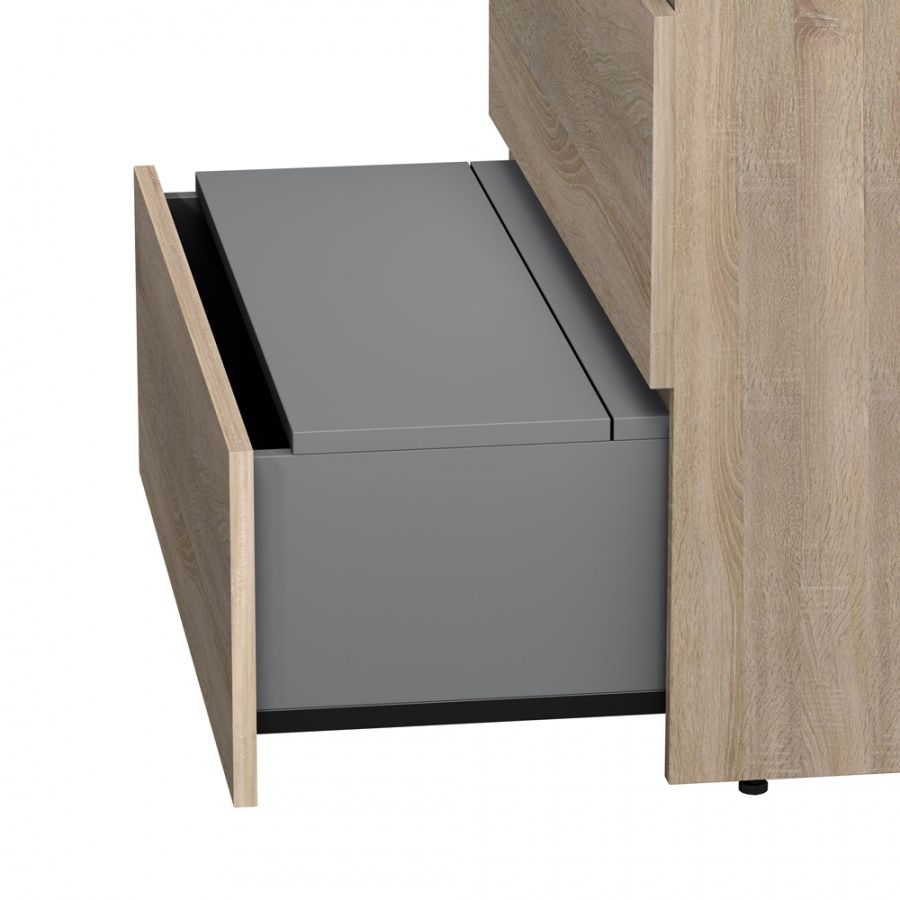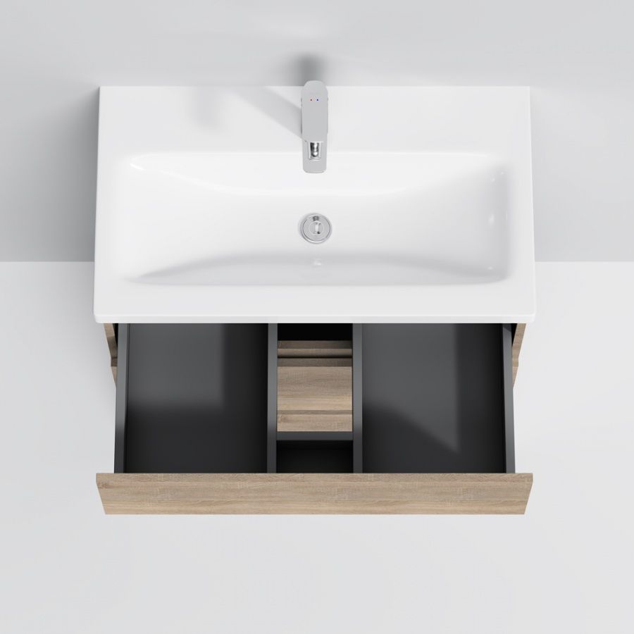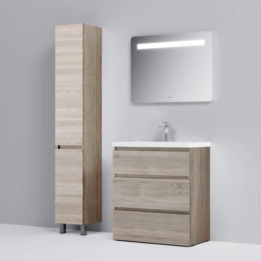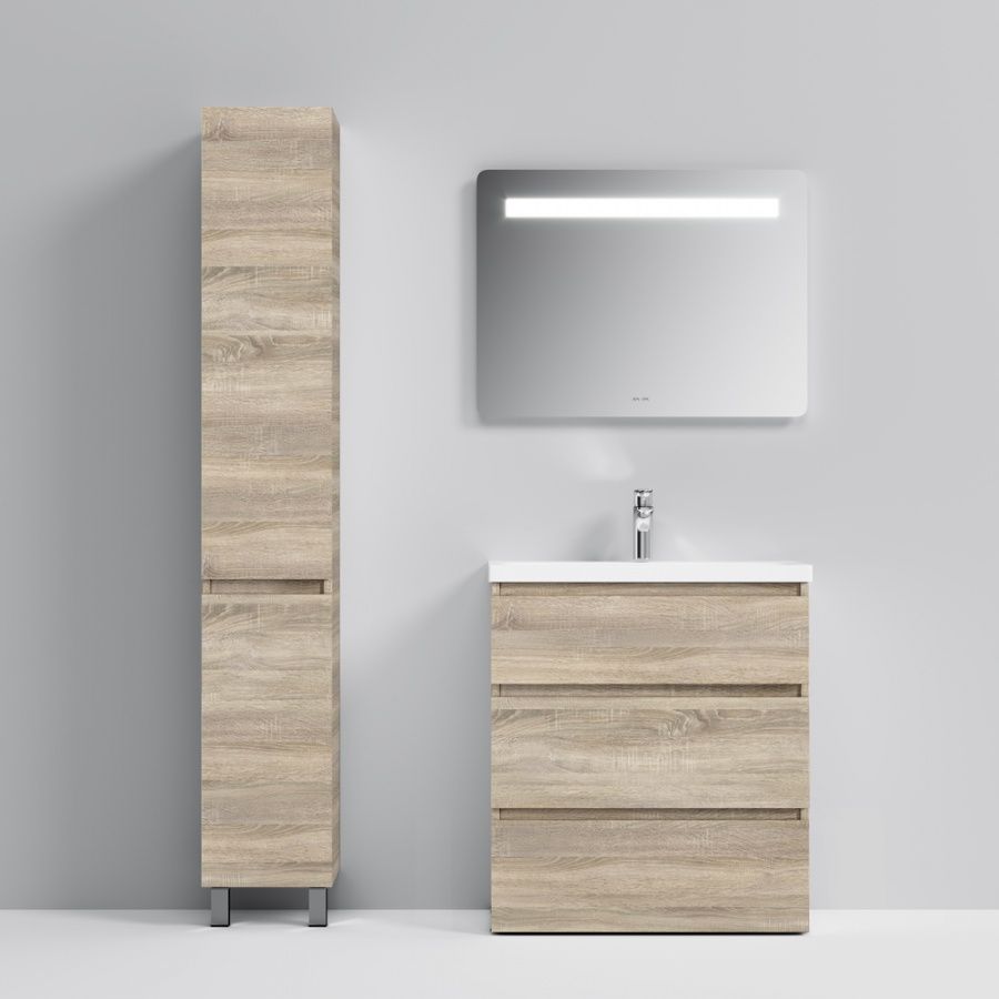 Тумба под раковину AM PM Gem S 75 с выдвижными ящиками, с двумя ножками. Современный европейский дизайн от DanelonMeroni (Великобритания/Италия). Уникальный нижний ящик базы может быть использован как: выдвижная подставка для детей, для удобного мытья рук (выдерживает нагрузку до 60 кг), дополнительная ниша для хранения (экономия пространства ванной комнаты). Ящики с антискользящим покрытием цвета антрацит – европейский стандарт. Повышенная влагостойкость мебели: окрашенные в 7 слоев поверхности мебели в цвете белый глянец , влагостойкая плита мебели в цвете светлый дуб.
