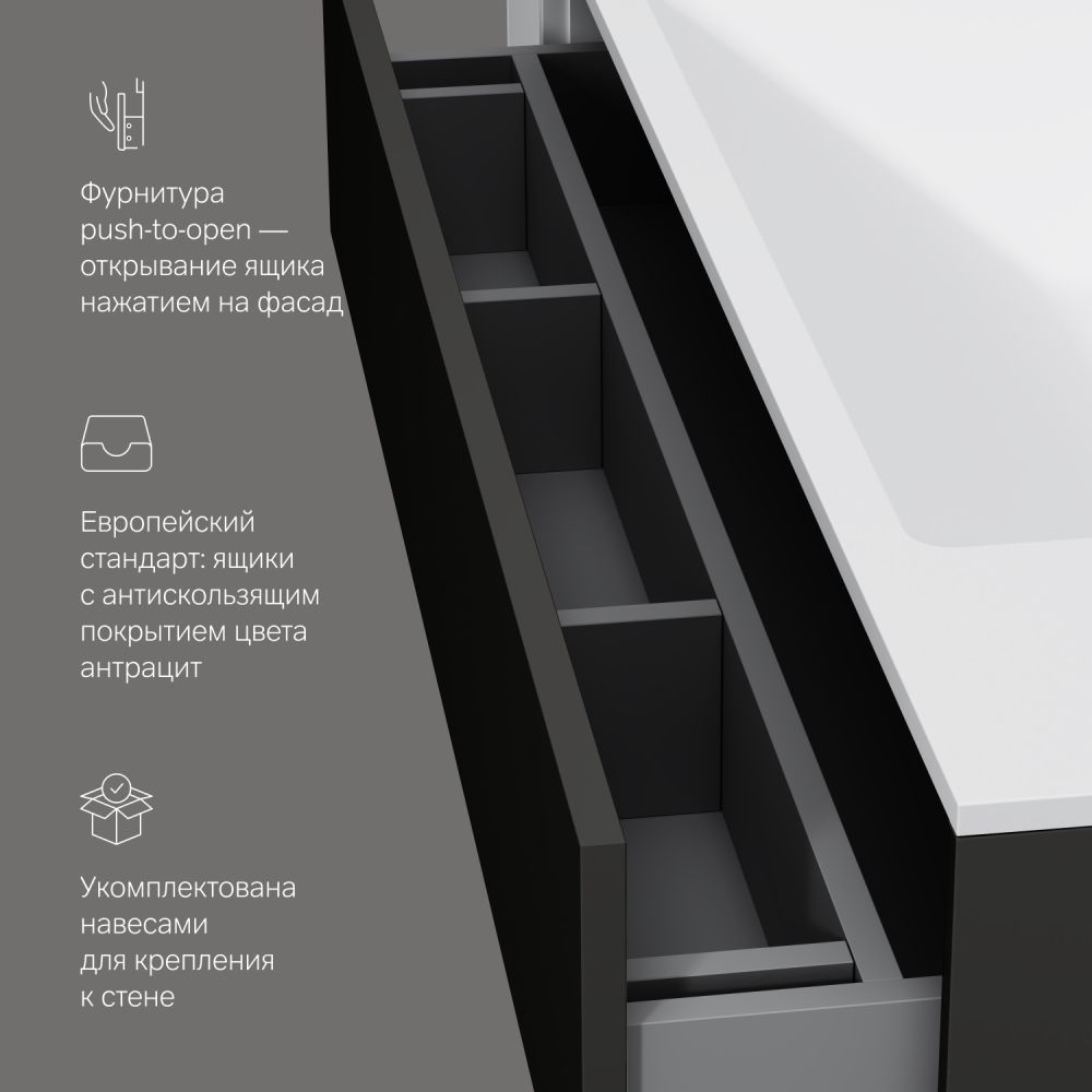 Подвесная тумба под раковину AM PM Inspire V2.0 100 с тремя выдвижными ящиками (один скрытый). Мебель Inspire V2.0 – идеальный выбор для тех, кто привык к динамичному стилю жизни, ценит абсолютный комфорт и минимализм в интерьере. Вариативность размеров и цветов дает неограниченные возможности для создания стильного дизайна ванной комнаты с учетом ее планировки и индивидуальных предпочтений владельца. Ультратонкая раковина эргономичной формы с покрытием из мрамора идеально сочетается с мебельной базой. Инновационный подход к хранению: мы разработали дополнительный ящик, который выдвигается на 12 см и обеспечивает быстрый доступ к самым необходимым вещам. Экологически чистые и долговечные полиакриловые эмали: специальная технология покраски в 7 слоев превосходит технологию нанесения автоэмали у ведущих немецких марок и обеспечивает насыщенный цвет в течение всего срока службы. Теперь в самых актуальных матовых оттенках.