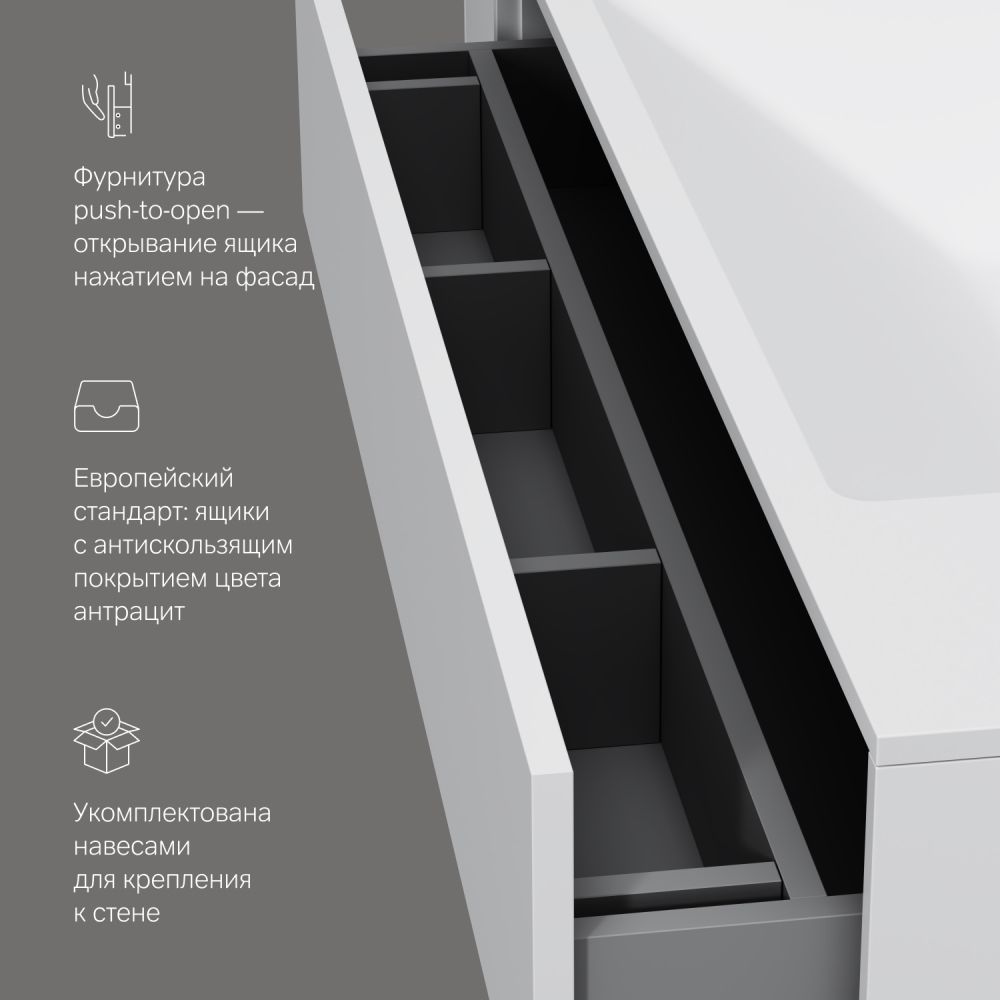 Подвесная тумба под раковину AM PM Inspire V2.0 100 с тремя выдвижными ящиками (один скрытый). Мебель Inspire V2.0 – идеальный выбор для тех, кто привык к динамичному стилю жизни, ценит абсолютный комфорт и минимализм в интерьере. Вариативность размеров и цветов дает неограниченные возможности для создания стильного дизайна ванной комнаты с учетом ее планировки и индивидуальных предпочтений владельца. Ультратонкая раковина эргономичной формы с покрытием из мрамора идеально сочетается с мебельной базой. Инновационный подход к хранению: мы разработали дополнительный ящик, который выдвигается на 12 см и обеспечивает быстрый доступ к самым необходимым вещам. Экологически чистые и долговечные полиакриловые эмали: специальная технология покраски в 7 слоев превосходит технологию нанесения автоэмали у ведущих немецких марок и обеспечивает насыщенный цвет в течение всего срока службы. Теперь в самых актуальных матовых оттенках.