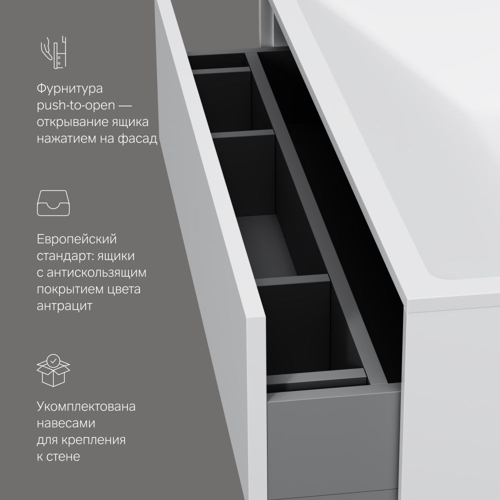 Подвесная тумба под раковину AM PM Inspire V2.0 80 с тремя выдвижными ящиками (один скрытый). Мебель Inspire V2.0 – идеальный выбор для тех, кто привык к динамичному стилю жизни, ценит абсолютный комфорт и минимализм в интерьере. Вариативность размеров и цветов дает неограниченные возможности для создания стильного дизайна ванной комнаты с учетом ее планировки и индивидуальных предпочтений владельца. Ультратонкая раковина эргономичной формы с покрытием из мрамора идеально сочетается с мебельной базой. Инновационный подход к хранению: мы разработали дополнительный ящик, который выдвигается на 12 см и обеспечивает быстрый доступ к самым необходимым вещам. Экологически чистые и долговечные полиакриловые эмали: специальная технология покраски в 7 слоев превосходит технологию нанесения автоэмали у ведущих немецких марок и обеспечивает насыщенный цвет в течение всего срока службы. Теперь в самых актуальных матовых оттенках.