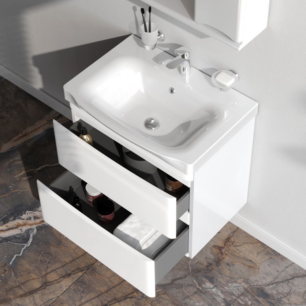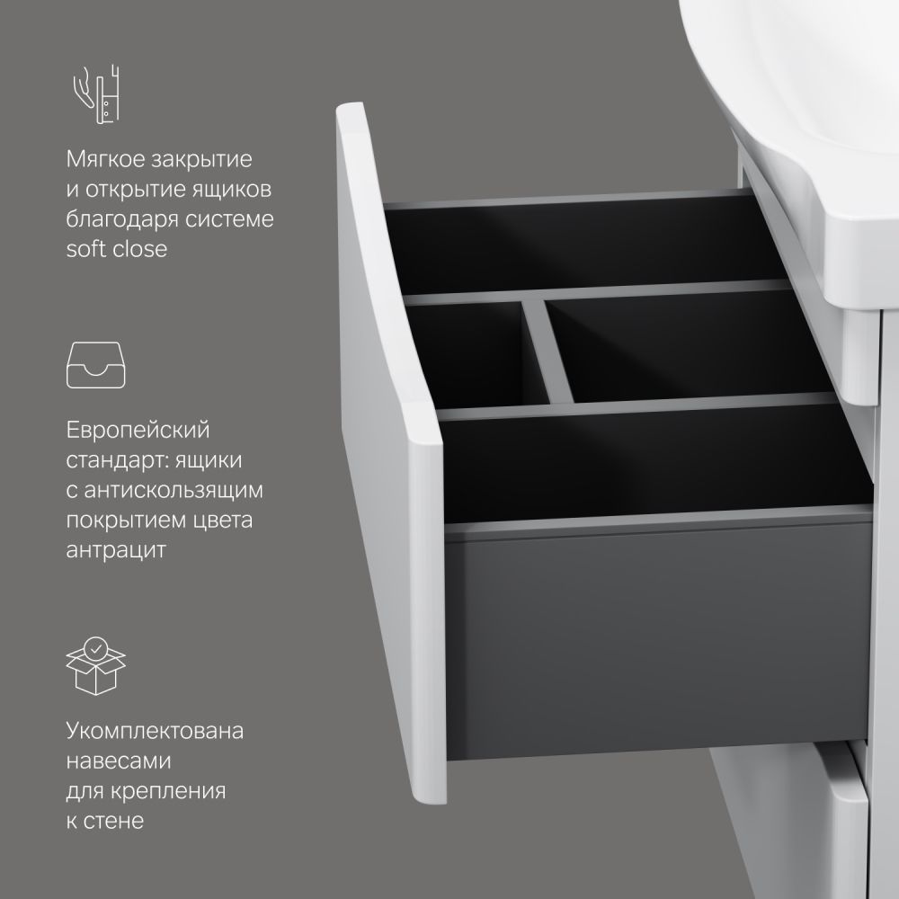 Подвесная тумба под раковину AM PM Like 65 M80FHX0652WG с двумя выдвижными ящиками. Впервые ультрамодная дизайнерская мебель в стиле Dynamic Organic стала представлена в доступном сегменте; Уникальная глубокая и удобная раковина со стилизованной губой - защищает от разбрызгивания воды; Утонченность в деталях: удобные интегрированные в фасад ручки идеально повторяют изгиб выступа раковины; Самое мягкое открытие и закрытие ящиков в классе: направляющие скрытого монтажа с системой мягкого закрывания soft close; Экологически чистые и удивительно долговечные полиакриловые эмали – специальная технология покраски в 7 слоев превосходит технологию нанесения автоэмали у ведущих немецких марок и обеспечивает насыщенный цвет в течение всего срока службы (от 10 лет).