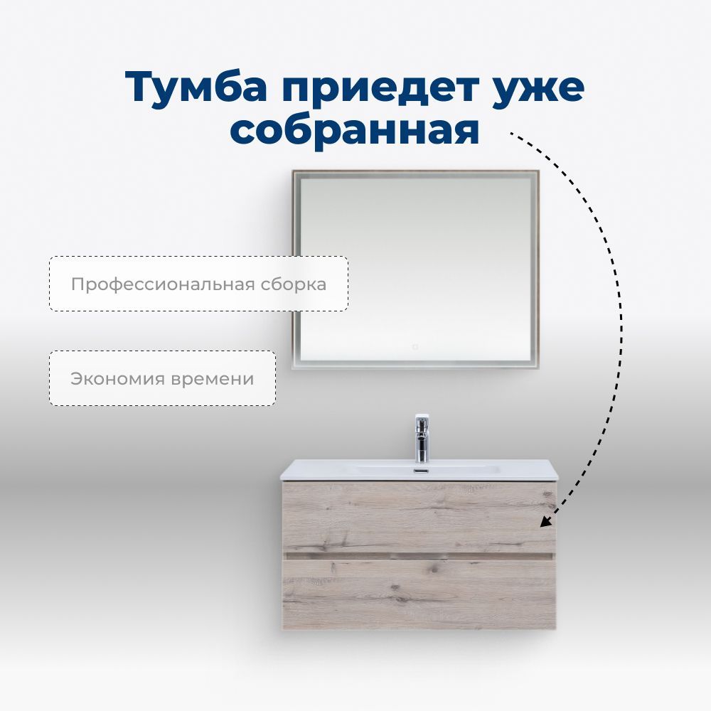 Комплект впишется в современный интерьер. Его можно дополнить пеналом «Алвита» New 35 (артикул 00277561), донным клапаном Allen Brau Infinity (артикул — 5.21026-31), зеркальным шкафом «Алвита» New 100 (артикул 00277545).