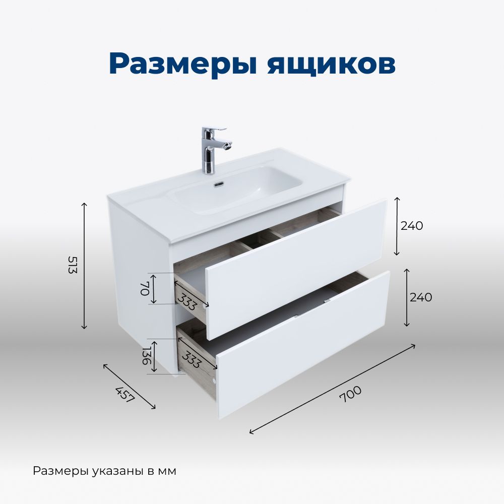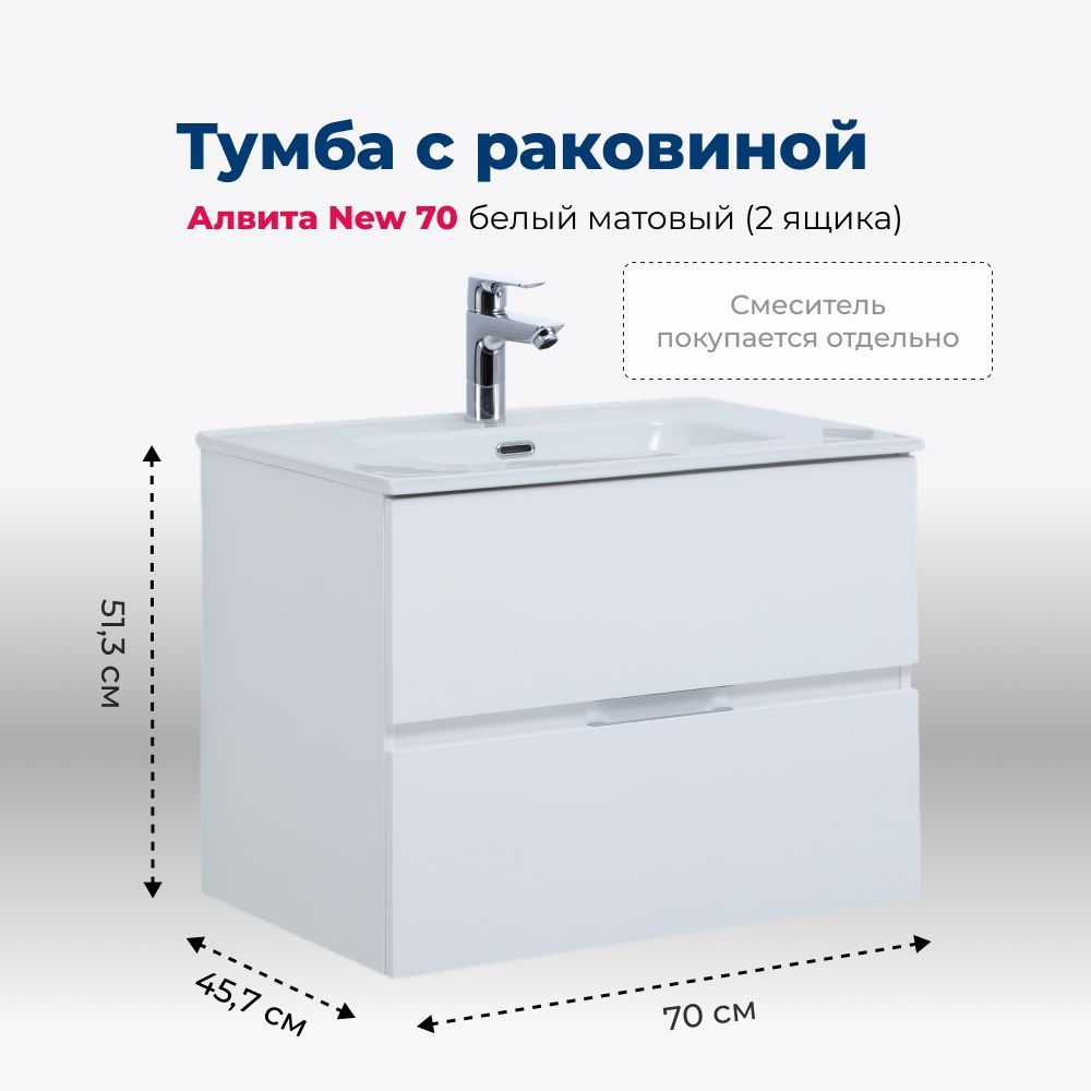 Тумба под раковину в ванную комнату бренда Aquanet выполнена в стиле модерн и входит в нашу коллекцию мебели Алвита New. Представленная коллекция мебели для ванных комнат осчастливила сотни покупателей, так как они приобрели сочетание дизайна, качества и функциональности. Важный момент при выборе тумбы для умывальника / раковины - это материалы. Они должны быть адаптированы к эксплуатации в условиях повышенной влажности. Влагостойкий ЛДСП - материал, из которого выполнен корпус изделия, фасад - из влагостойкого ЛДСП. При монтаже подвесной тумбы в первую очередь необходимо учесть ширину, которая равна 70 см. Тумба в цвете белый (белый матовый) освежит Вашу ванну и будет отлично сочетатся с сантехникой. Тумба в ванную также обеспечит вам экономию места, так как в ней предусмотрены вместительные ящики, оснащенные механизмом доводчика.