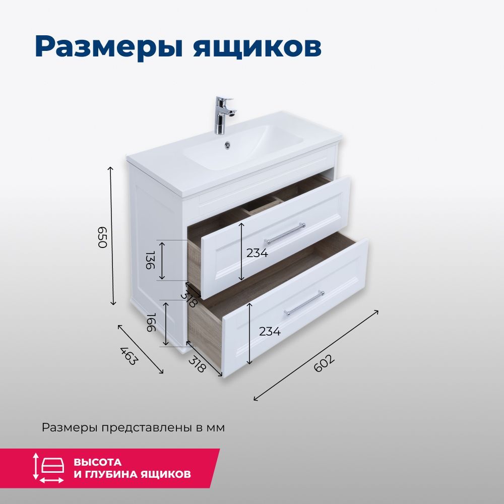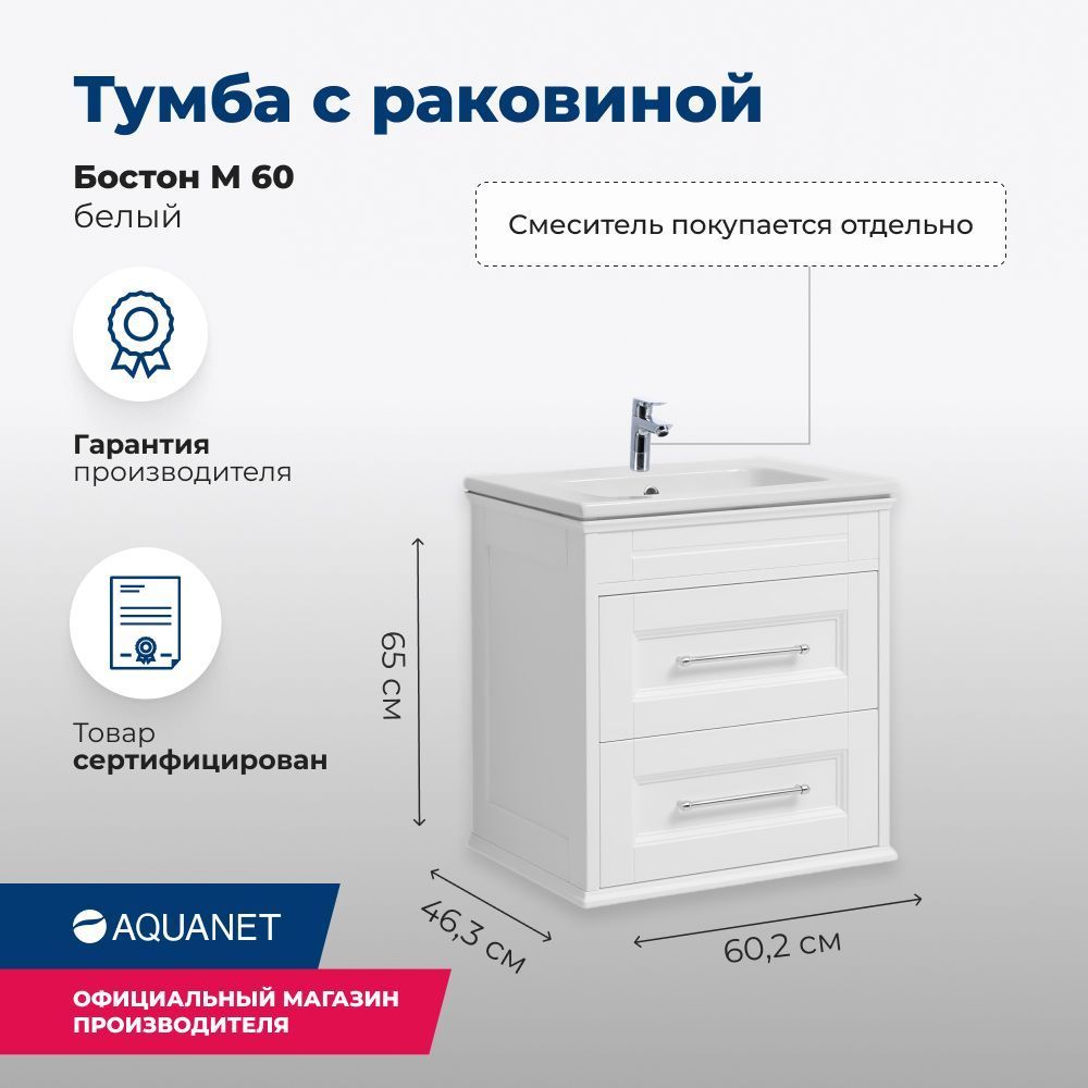 Тумба Aquanet Бостон 60 белого цвета интересна внешне. Фрезеровка по белоснежным матовым фасадам и по боковым ее частям придает внешнему виду изделия шириной 60 см достойный и благородный вид, свойственный классике. Но утонченные ручки производства известной турецкой фирмы System, словно ниточки поблескивающие на фасадах, визуальная легкость изделия напоминает о модерне. Тумба с двумя выдвижными ящиками, оборудованными доводчиками производства компании Hettich, вмещает огромное количество полезных вещей. В верхнем ящике предусмотрено три отделения, что делает его пространство более удобным для использования: все вещи будут на своих местах. Нижний ящик просторный и в него можно поставить многочисленные шампуни, гели, муссы, маски, кремы и другие емкости. Тумба комплектуется качественной керамической раковиной «Эйфория», изготовленной по чешской шамотной технологии компанией Dreja. Модель имеет два варианта монтажа. Базовый – подвесной. Кроме того, специально для этой коллекции были разработаны очень элегантные ножки, выполненные из массива и окрашенные в белый цвет. С такими ножками тумба приобретает благородный вид и еще больше тяготеет по своему стилю к классике.