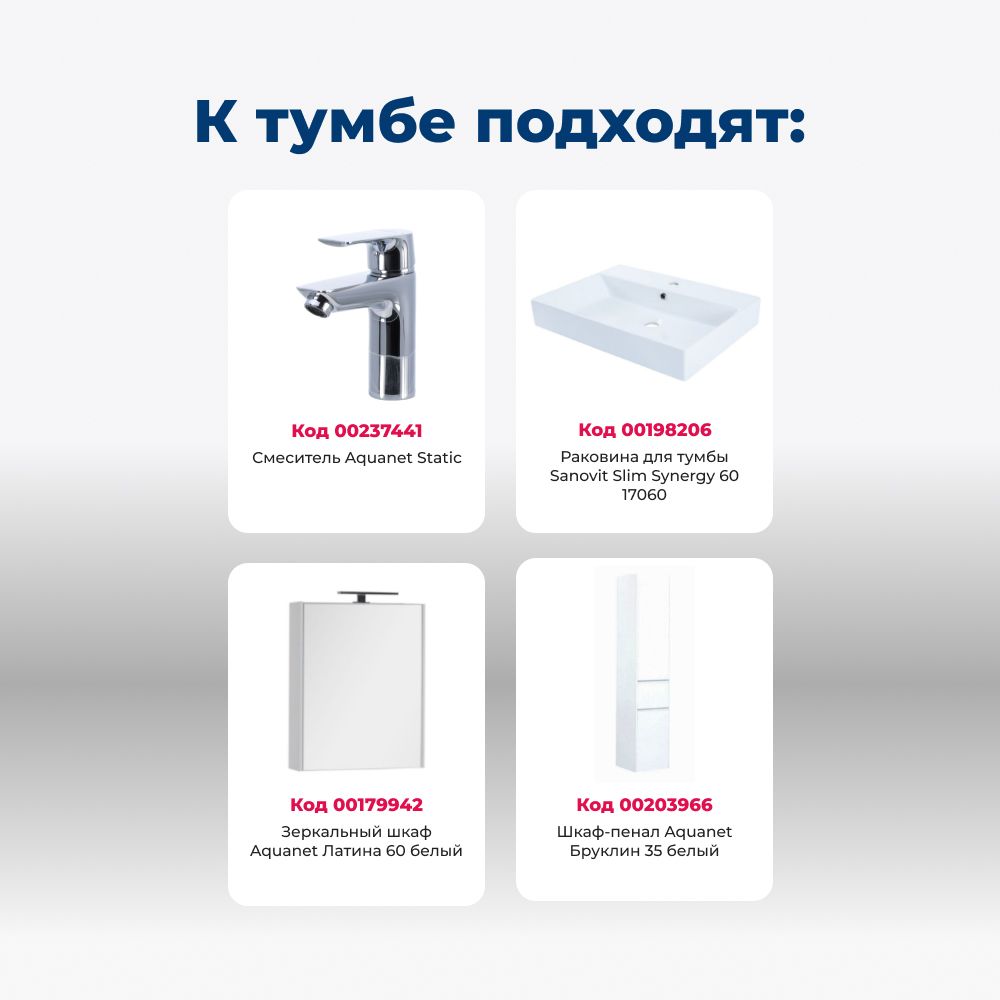 Тумба с раковиной Aquanet Бруклин 60 белого цвета предназначена для подвесной установки Изделие отвечает тенденциям минимализма Аскетизм четких линий и обтекаемых форм в ней доведен до совершенства В модели нет никаких выделяющихся деталей, и даже ручки интегрированные, когда открывание происходит за счет выступающей детали верхней или нижней части фасада, которая срезана под углом, в результате чего образуется выемка, служащая ручкой В тумбе ручка устроена таким образом у верхнего ящика в нижней части фасада, а у нижнего – в верхней Такое простое решение добавляет изысканности внешнему виду изделия Раковина из керамики с тонкими изящными бортиками идет размер в размер с тумбой, ширина которой 60 см, в результате чего все изделие выглядит как единое целое Корпус изделия выполнен из выкрашенного белой краской влагостойкого ЛДСП, фасады – из МДФ На контрасте с белизной внешних деталей стильно смотрится корпус выдвижных ящиков, выполненный в цвете «дуб сонома» Нижний ящик тумбы имеет большую зону хранения, верхний разделен на несколько отделений, которые помогут грамотно разложить все необходимое по своим местам