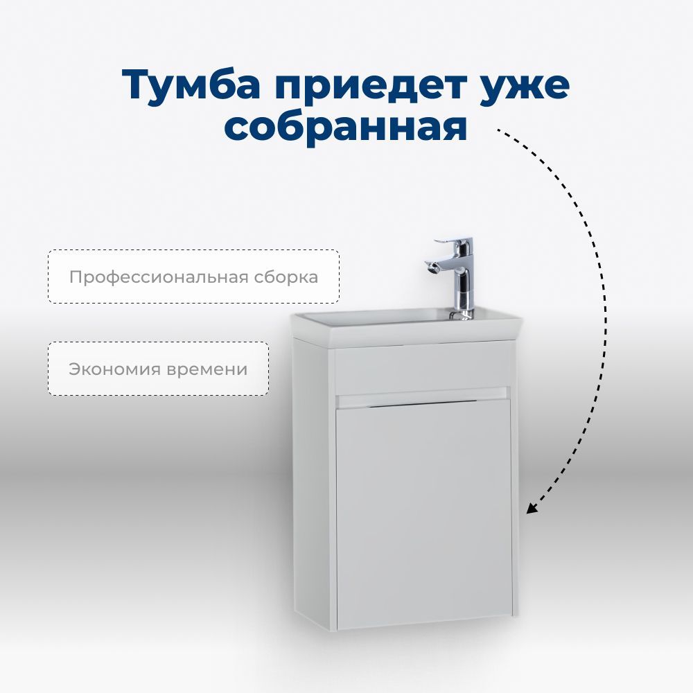 В тумбе предусмотрены просторные полки, а столешницей служит глубокая прямоугольная керамическая раковина. Отверстие под смеситель для удобства расположен по правую руку.