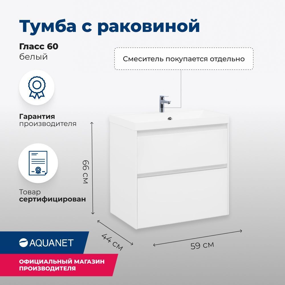 Тумба с раковиной Aquanet Гласс 60 белого цвета смотрится эффектно благодаря сочетанию белого матового стекла на фасаде верхнего выдвижного ящика с белоснежными глянцевыми поверхностями корпуса, выполненного из МДФ. Такое покрытие, к тому же, надежно защищает мебель от воздействия воды. «Изюминку» во внешний вид вносит внутренняя часть выдвижных ящиков, выполненная в цвете «дуб сонома». Древесная фактура вносит свежесть и живописность в дизайн всего изделия.