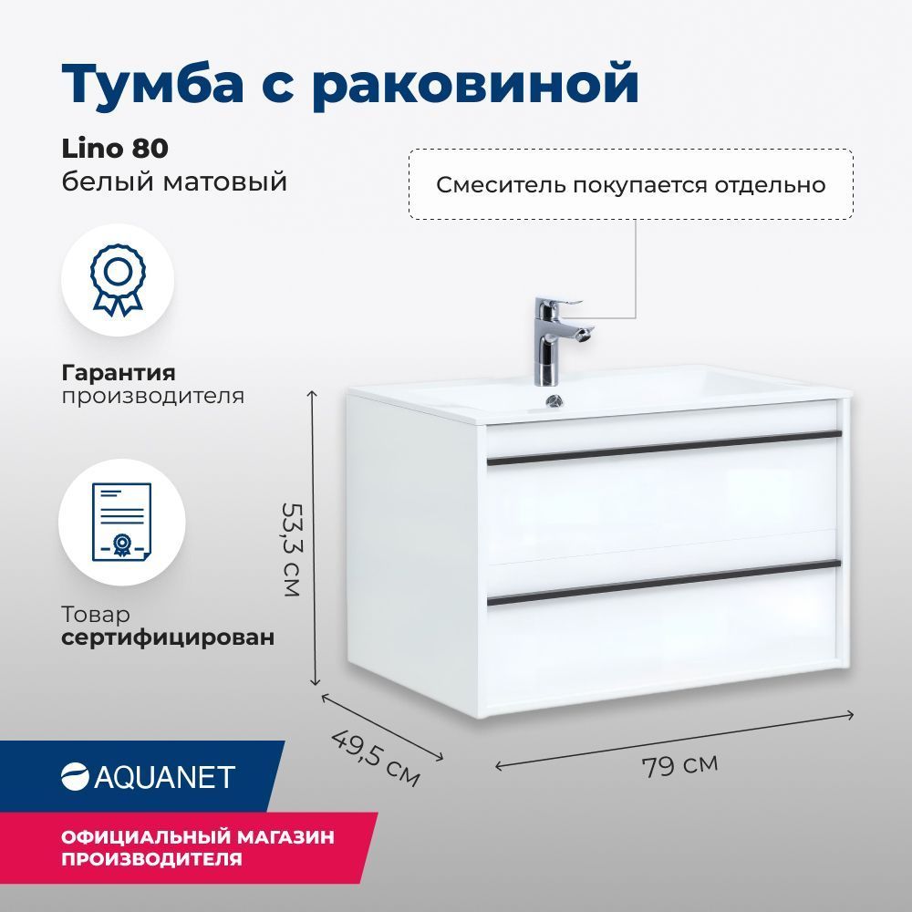 Тумба с раковиной Aquanet Lino 80 белый матовый - яркий пример мебели в эко-стиле. У нее удобная зона хранения: два выдвижных ящика, оборудованных доводчиками, словно утоплены внутрь корпуса. Тонкие изящные ручки во всю ширину ящиков. Именно они находятся в одной плоскости с боковыми стенками. Выглядит стильно. К тому же, безопасно, так как нет выступающих деталей. Кстати, ручки отечественного производства. Сделаны из алюминия, чтобы исключить возможность коррозии, по заказу Aquanet специально для этой коллекции. Сверху на них нанесено эмалевое покрытие. Сверху – раковина «Электра» из литьевого мрамора. У нее максимально глубокая и объемная чаша, но все внутренние детали скруглены, так что приведение ее в порядок не составит труда, так как грязь не будет скапливаться в уголках. Корпус и фасады тумбы шириной 80 см – из влагостойкого ЛДСП, внутренняя часть ящиков выполнена в цвете «дуб кантри», что создает легкий контраст белоснежным деталям корпуса и фасада.