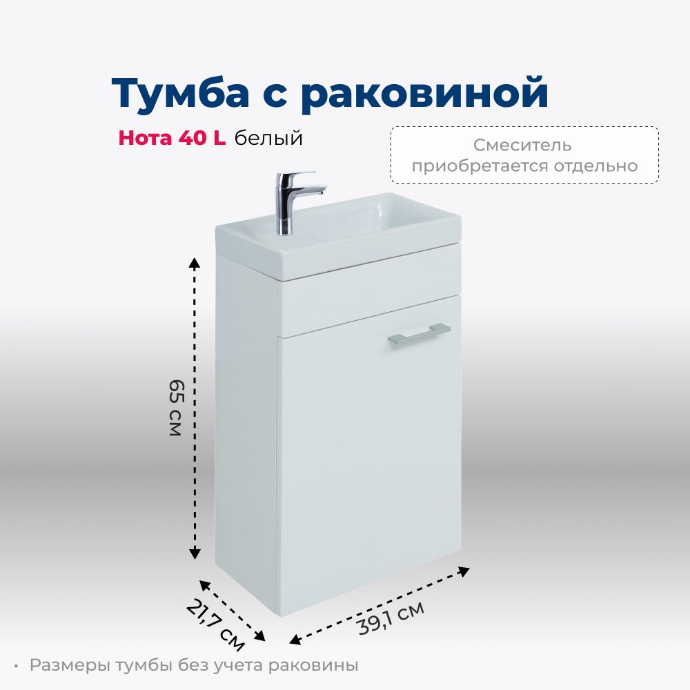 Тумба с раковиной Aquanet «Нота» 40 L (Moduo) — компактная модель белого цвета с левосторонней ориентацией, которая подойдет для обустройства небольшой ванной комнаты или санузла. Монтаж настенный, что облегчает уборку напольного покрытия. Корпус сделан из устойчивой к воздействию влаги ЛДСП, фасады — из МДФ. За распашной дверцей, дополненной серебристой ручкой, располагается одна полка для хранения.