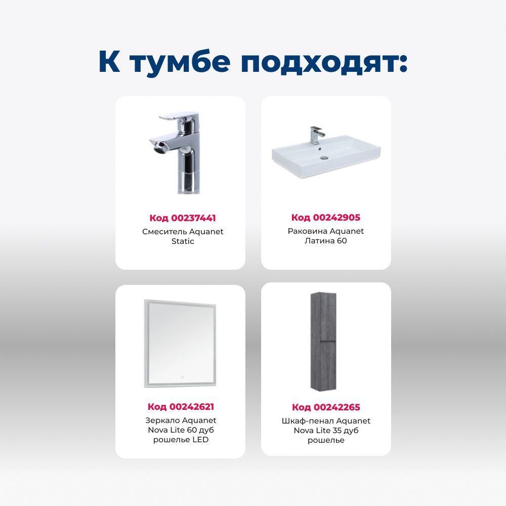 Тумба с раковиной Aquanet Nova Lite 60 в исполнении «дуб рошелье» — идеальный вариант для дополнения ванной комнаты в любом из современных стилей. Лаконичный дизайн с претензией на натуральность позволяет освежить санузел смелым решением. Компактные размеры 576*735*442 мм подойдут как для малых помещений, так и для просторных. Напольная модель оснащена ножками и тремя выдвижными шкафами. Пространство внутри организовано для хранения вещей и бытовой химии с учетом коммуникаций для водоотведения. Корпус и фасад мебели изготовлены из влагостойкого ЛДСП, который препятствует образованию плесени и грибка при длительном взаимодействии с водой и влажным воздухом. Выдвижные шкафы оснащены механизмом доведения, что обеспечивает плавное закрытие. В комплект к тумбе можно купить подходящую по размерам керамическую раковину от Aquanet, например модель «Латина», которая легко подсоединяется к мебели.