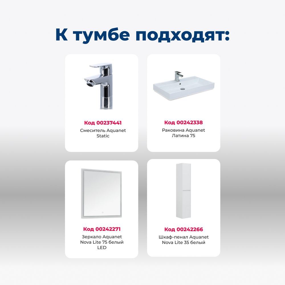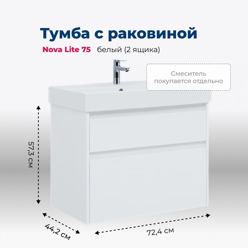 Тумба с раковиной Aquanet Nova Lite 75 белоснежного цвета из влагостойкой ламинированной древесно-стружечной плиты выглядит нарядно. Подвесной монтаж придает визуальную легкость тумбе шириной 75 см. Она оборудована двумя выдвижными ящиками. Ящики довольно вместительные и позволяют разместить все необходимое. Комплектуются направляющими немецкого производства Hettich Quadro, оснащенными доводчиками. Фасады выполнены с декоративной интегрированной ручкой, не имеющей острых краев и внутренних углов, что обеспечивает удобство эксплуатации и легкий уход за мебелью. Неглубокая и стильная керамическая раковина «Латина» идеально подходит к тумбе.