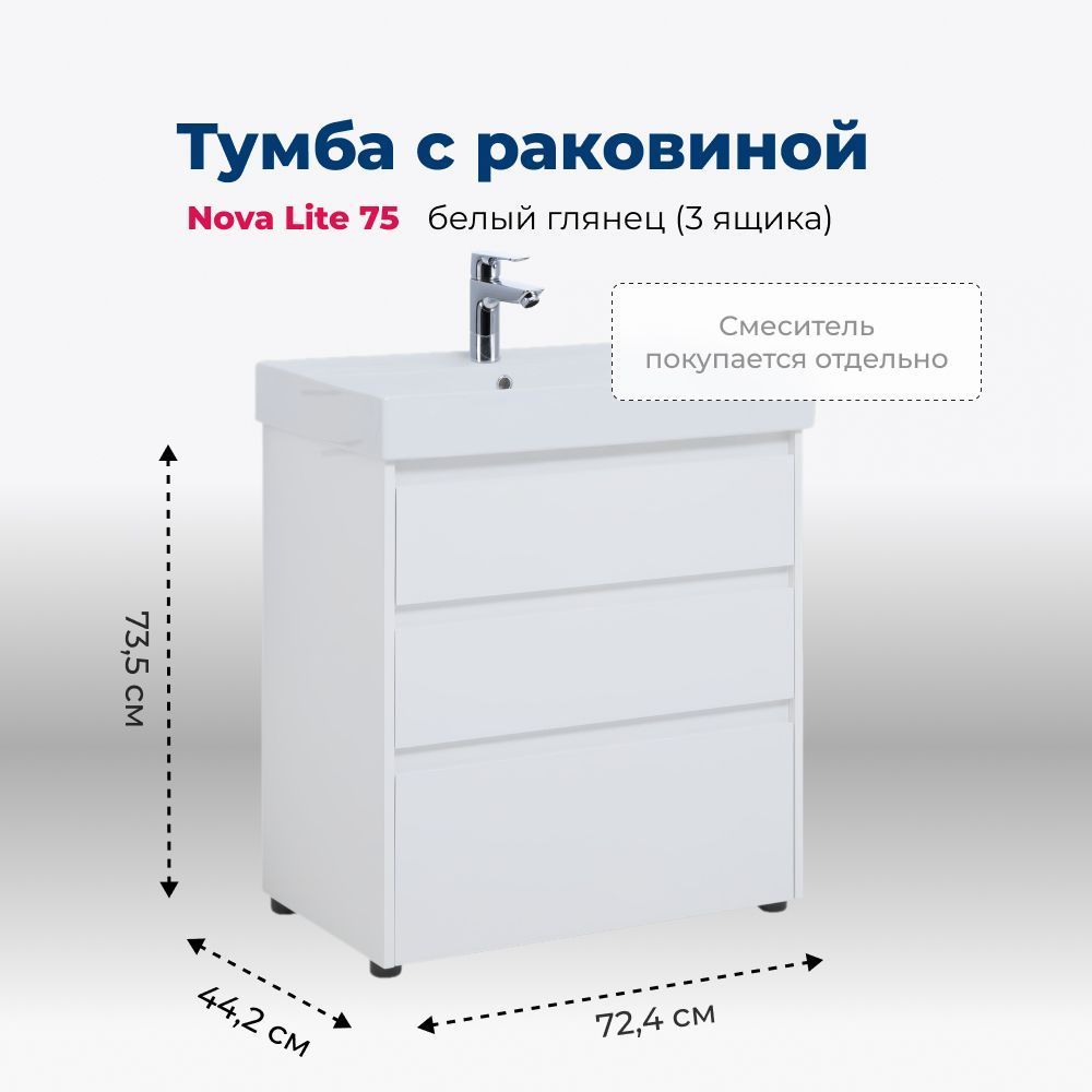 Тумба с раковиной Aquanet Nova Lite 75 в белом глянцевом исполнении — идеальный вариант для дополнения ванной комнаты в любом из современных стилей. Лаконичный дизайн с претензией на натуральность позволяет освежить санузел смелым решением. Компактные размеры 724*735*442 мм подойдут как для малых помещений, так и для просторных. Напольная модель оснащена ножками и тремя выдвижными шкафами. Пространство внутри организовано для хранения вещей и бытовой химии с учетом коммуникаций для водоотведения. Корпус и фасад мебели изготовлены из влагостойкого ЛДСП, который препятствует образованию плесени и грибка при длительном взаимодействии с водой и влажным воздухом. Выдвижные шкафы оснащены механизмом доведения, что обеспечивает плавное закрытие. В комплект к тумбе можно купить подходящую по размерам керамическую раковину от Aquanet, например модель «Латина», которая легко подсоединяется к мебели.