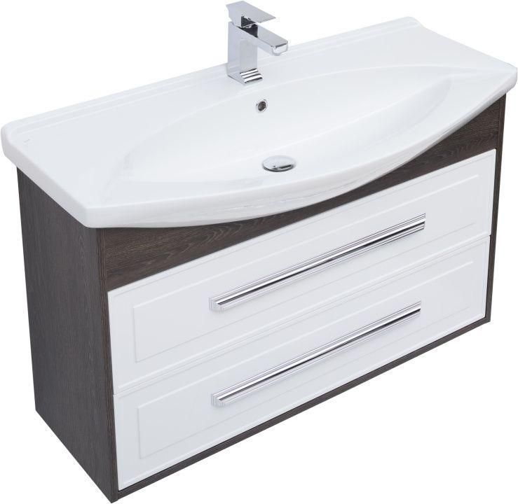 Тумба с раковиной Aquanet Остин 105 в цвете "дуб кантербери/белый" чрезвычайно эффектно смотрится благодаря яркому контрасту шоколадных деревянных деталей корпуса в цвете «дуб кантербери» с белыми глянцевыми фасадами выдвижных ящиков со строгой фрезеровкой. Лаконичные хромированные ручки подчеркивают элегантность узора на фасаде. Особенно хороша на этом фоне белоснежная керамическая раковина чешского бренда Dreja, которая в этом комплекте является не только функциональной деталью, неотъемлемой частью тумбы, но и декоративным элементом. Тумба шириной 105 см станет настоящим украшением интерьера, выполненного в любом стиле.