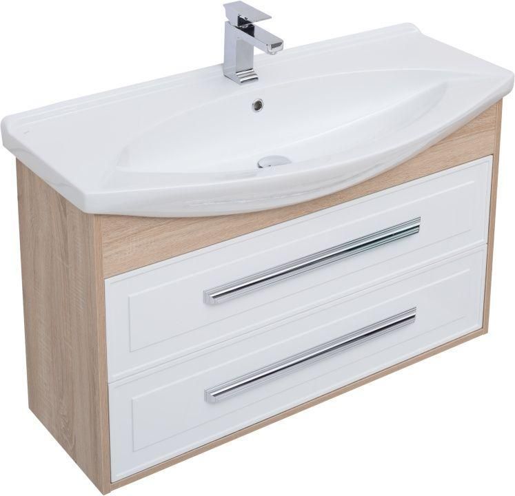 Тумба с раковиной Aquanet Остин 105 в цвете "дуб сонома/белый" чрезвычайно эффектно смотрится благодаря мягкому контрасту светлых деревянных деталей корпуса в цвете «дуб сонома» с белыми глянцевыми фасадами выдвижных ящиков со строгой фрезеровкой. Лаконичные хромированные ручки подчеркивают элегантность узора на фасаде. Особенно хороша на этом фоне белоснежная керамическая раковина чешского бренда Dreja, которая в этом комплекте является не только функциональной деталью, неотъемлемой частью тумбы, но и декоративным элементом. Тумба шириной 105 см станет настоящим украшением интерьера с акцентом на стили ретро, кантри, прованс.