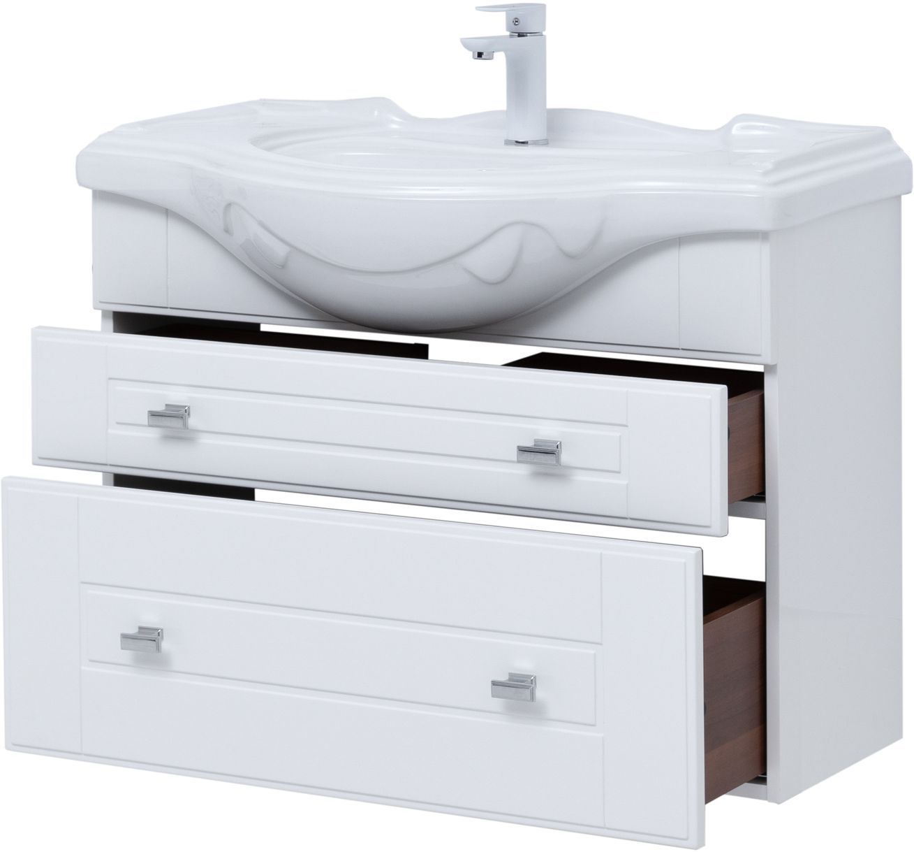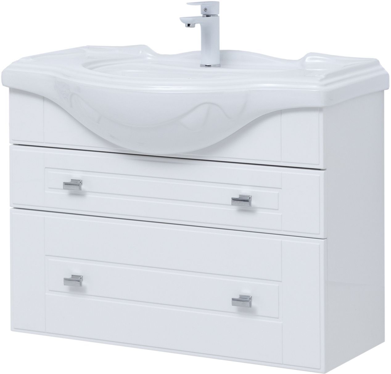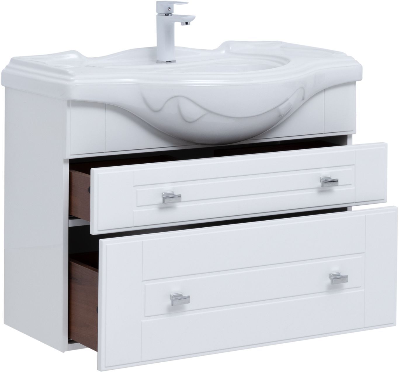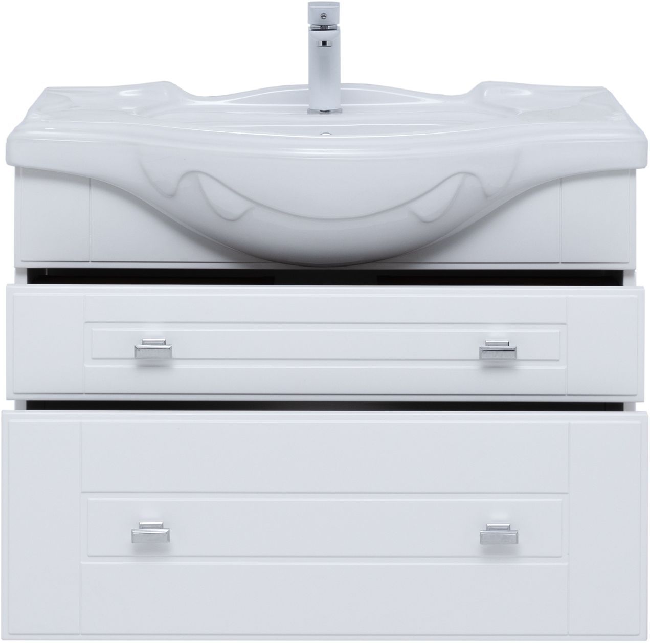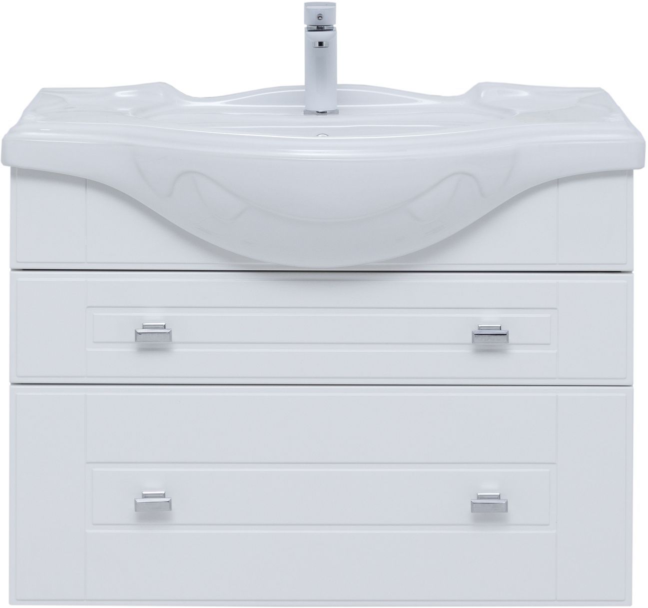 Тумба с раковиной Aquanet «Рондо» 85 в белом глянцевом корпусе оснащена двумя ящиками, обладающими разной высотой. Их можно использовать как для хранения гигиенических и косметических средств, так и для размещения порошков, гелей и кондиционеров для белья. На фронтальных панелях встроены аккуратные хромированные ручки прямоугольной формы.